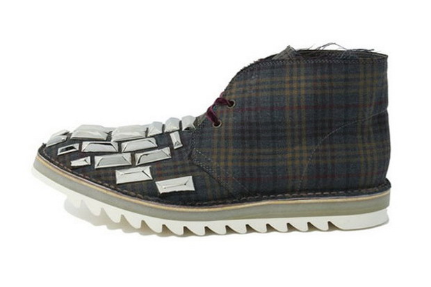 从街头发迹,发展至时尚舞台的日本品牌 Undercover 此回发表了秋冬系列的鞋款新品,以高桥盾先生一贯擅长使用的街头元素结合传统 chukka boot 鞋型,于格纹鞋面上饰以金属铆钉,搭配栗色鞋带及白色橡胶波纹鞋底,共有咖啡色及灰色两款色系,散发出浓厚的摇滚风味,冲突感满载。 |