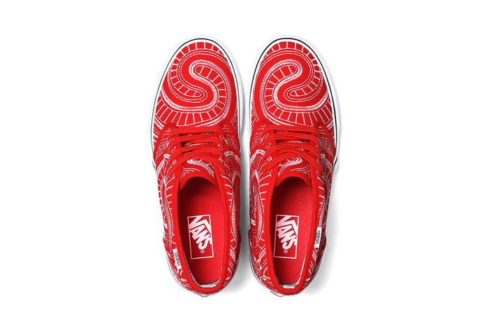 在继今年初与 Playboy 和 Comme des Garcons SHIRT 的合作后,于 2014 春夏季度,纽约街头品牌 Supreme 再度携手滑板品牌 Vans,带来这个全新的鞋履系列。该系列共包括有 Chukka 与 Era 两双 Vans 经典轮廓,采用优质耐用的帆布面料制作,于鞋面上通过白色车线勾勒出抽象的漩涡状图案攀附,此外还搭配柔软皮革内里以及签名式的白色硫化鞋底呈现。 该系列鞋款共有黑、红、深蓝三种配色可供选择,将于 5 月 15 日开始于 Supreme 纽约、洛杉矶、伦敦和线上店铺发售,随后于 17 日登陆日本。