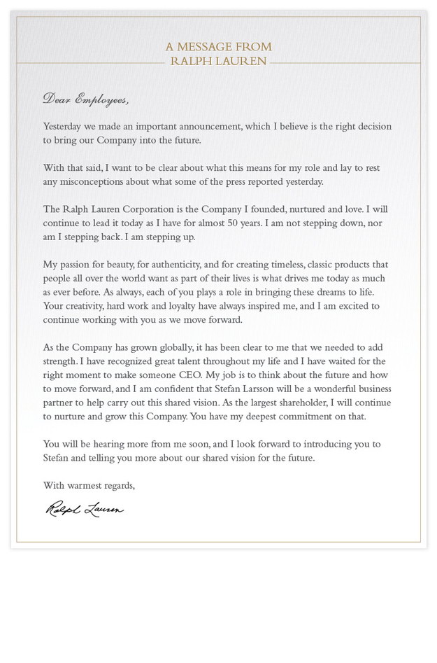早前 Ralph Lauren 宣布退下自己所创同名品牌 CEO 的职位,但并不代表从此离开公司。他在 《The New York Times》 中透露会作为 Executive Chairman 和 Chief Creative Officer ,同时发放了一封公开信予员工-「I am not stepping down, nor am I stepping back. I am stepping up.」。新接任者 Stefan Larsson 亦大有来头,曾经成功把 H&M 打造为现今最大型的 Fast-Fashion 业务,在他管理下的 Old Navy 营利甚至超越其母公司 Gap 。要解决 Ralph Lauren 面对于的财政压力,Stefan Larsson 绝对是适合人选。以下为 Ralph Lauren 的公开信: |