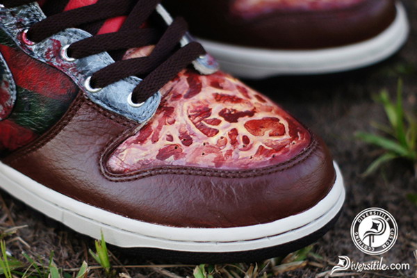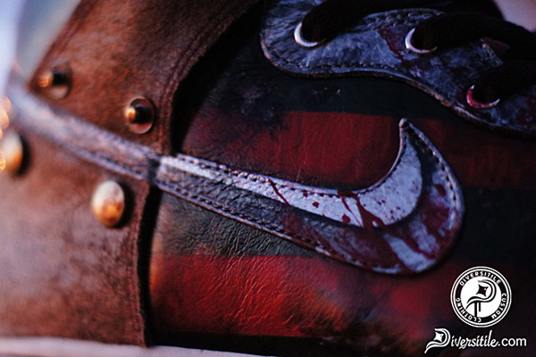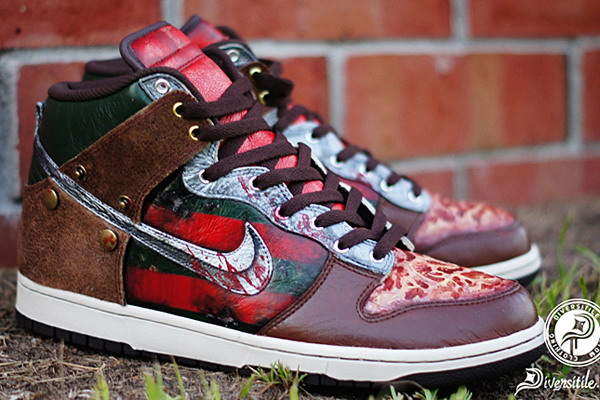 在西方人们享受万圣节的奇幻和恐怖时又对它抱有不可思议的幻想,各种围绕万圣节主题的产品也同时受到大众欢迎,Nike Sportswear最新力作DIVERSITILE NIGHTMARE DUNK (FREDDY KRUEGER)鞋款与T恤的释出,将会让你我感受到浓重的美式恐怖片的风格,血腥画面不只在《猛鬼街》的影片中表现的那么深入人心,设计单位Diversitile为让效果达到极致,在DUNK鞋款中大量利用油画般的手绘工艺,将梦魇FREDDY的残忍及血腥也得以夸张表现,在这血迹斑斑中象征FREDDY的皮手套与钢爪在细节处同样有所修饰,熟悉《猛鬼街》的朋友定会大呼过瘾,而且红绿条纹布与焦肉般的生动刻画使包裹着的鞋盒也不再那么普通,虽说稍许极端但真实感格外强烈,或许你对这突如其来的视觉佳宴有些神会颠倒,但宛如身临其境的魅力确实是独一无二的。