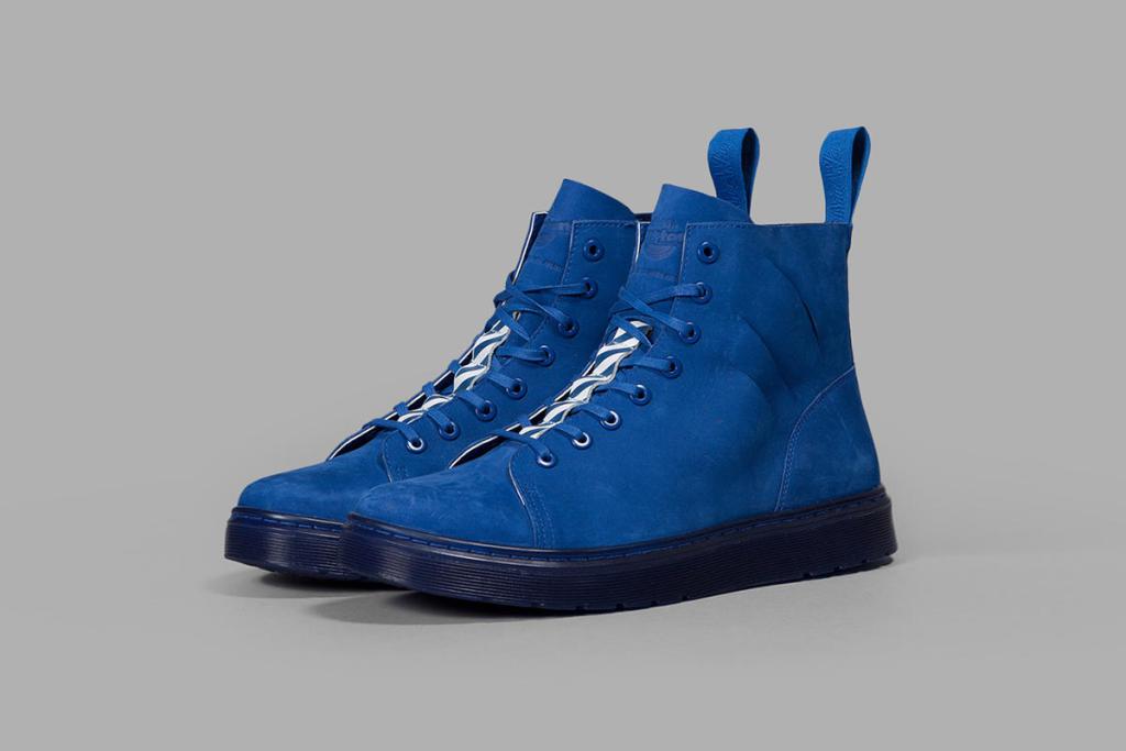 OFF-WHITE 在 2016 秋冬季度与英国鞋履老牌 Dr. Martens 合作打造了联名靴款系列。均选择 Dr. Martens 经典靴款作为蓝本,其中黑、蓝两双均以鞋筒两侧的切割线条作为细节,并在鞋舌上和后跟注入 OFF-WHITE 签名式的斜纹图案;而米色与深蓝两双则分别由麂皮和皮革构成鞋身,通过黄、红二色的鞋带、鞋带孔和后跟拉标制造对比。定价分别约为 $404 和 $574 美元,目前这个联名系列已可经由 Antonioli 等指定店铺购得。