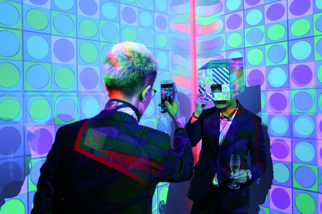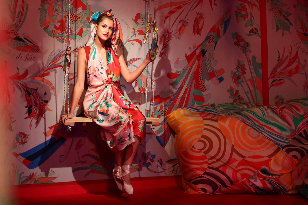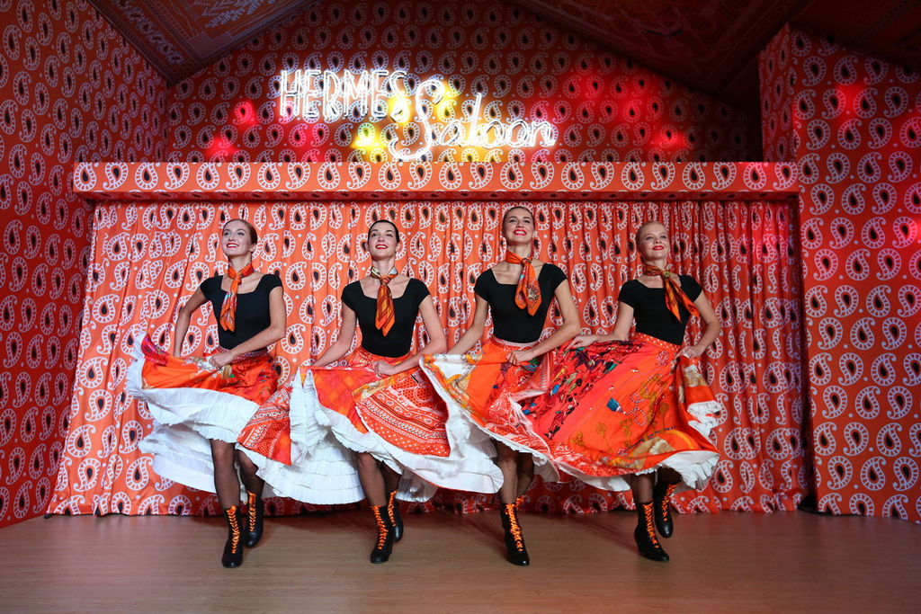 上周位于上海淮海中路的 Hermès Mansion 迎来了不一样的一夜。为了庆祝这座楼高四层、Hermès 于中国的旗舰建筑开业两周年,品牌把内里重新打造,以各种签名式方巾图案改变了内装,变为活色生香的视听味觉盛宴,去款待各 VIP 与受邀宾客。 原来一楼位置,以艺术鸟舍作为灵感命名为「真丝天堂」,为参与宾客提供美食与美酒,还有仿剌青与照相馆小游戏先暖身。二楼开始便是别开生面的表演,先是色彩艺术家 Splash 陪伴到访的宾客从中挑选出装载了不同颜料的小汽球投掷至墙面,并解说相应的色彩涵义,直接绘制出色彩创意墙。再上一层楼,看到游乐场一样的设定,既有投篮的「H 型锚链世界」,用了印有爱马仕丝巾图案的纸球,代替了传统篮球进行比斗;还有以原创丝巾图案为灵感,以 3D 投射进行动态自拍效果。原来经常用作展览之用的第四层,便命名为「橙色沙龍」,以 Hermès 专属的橙色布置成表演舞台,有乐手演出,亦有舞蹈表演,去为这个百年品牌于上海的地标庆生。