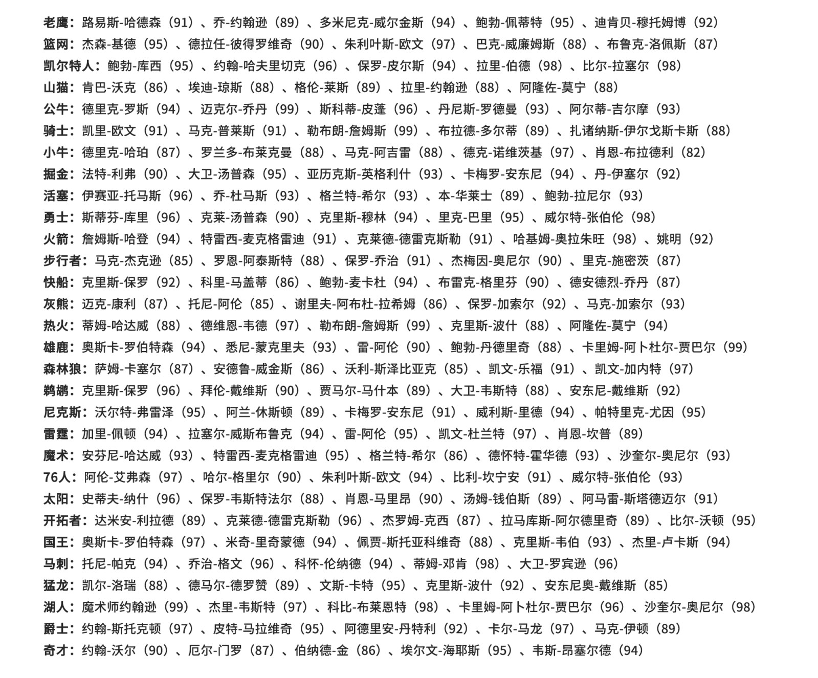 因为 Kyrie Irving 转会而不得不更换封面的《NBA 2K18》可谓出师不利,不过 NBA 每支球队「历史最强阵容」的加入,还是让玩家对于这一代作品充满了期待,此番 NBA 2K 便正式公布了一段「All Time Team」的特别版预告,更在官方 Facebook 主页揭晓了每支球队的最强阵容名单、球员数值,以及球队排名!NBA 史上夺冠次数最多的两支球队 LA Lakers 和 Boston Celtics 毫无疑问占据前两名,两支球队的平均球员数值分别为 92.53 和 92.47;拥有篮球之神 Michael Jordan 的 Chicago Bulls 位列第六;LeBron James 所效力的 Miami Heat 和 Cleveland Cavaliers 分列第 16 和 18 位;而实力最弱的球队则是 Memphis Grizzlies。 下面就为大家带来这份「队史最强阵容」的具体战力排名,也欢迎大家在评论处留下你的观点! NBA 2K18「队史最强阵容」战力排行榜 1. Los Angeles Lakers (92.53) 2. Boston Celtics (92.47) 3. Golden State Warriors (90.87) 4. Oklahoma City Thunder (89.67) 5. New York Knicks (89.47) T6. Chicago Bulls (89) T6. Detroit Pistons (89) T8. Sacramento Kings (88.47) T8. Phoenix Suns (88.47) 10. San Antonio Spurs (88.4) 11. Denver Nuggets (88.3) T12. Utah Jazz (88.27) T12. Brooklyn Nets (88.27) T14. Milwaukee Bucks (88) T14. Houston Rockets (88) 16. Miami Heat: (87.73) 17. Philadelphia 76ers (87.6) 18. Cleveland Cavaliers (87.47) 19. Atlanta Hawks (87.27) 20. Portland Trail Blazers (87.2) 21. Washington Wizards (86.4) 22. Minnesota Timberwolves (86.33) 23. Indiana Pacers (86) 24. Dallas Mavericks (85.93) 25. Los Angeles Clippers (85.8) 26. Orlando Magic (85.73) 27. New Orleans Pelicans (85.13) 28. Charlotte Hornets (85.07) 29. Toronto Raptors (84.87) 30. Memphis Grizzlies (84.73) |