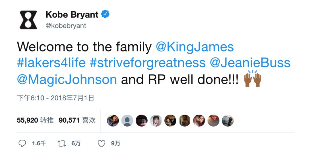 牵动无数球迷的 LeBron James「决定 3」终于在今天早上正式公布,这位连续八年夺得 NBA 东部冠军的球员将来到「狂野西部」,并与传奇豪门 LA Lakers 签下 4 年 $1.54 亿美元的长约,而作为 Lakers 招牌之一的 Kobe Bryant 则通过社交媒体表达了对于 King James 的欢迎,以及对于球队管理层的赞赏。长久以来,有关两人谁才是 NBA 第一人的争论让他们各自的球迷「势不两立」,如今随著 LeBron 加入 Lakers 大家庭,Lakers 球迷无疑将成为球迷届的最大势力。 至于 LeBron 能否为 Lakers 吸引到更多球星加盟,我们拭目以待! |