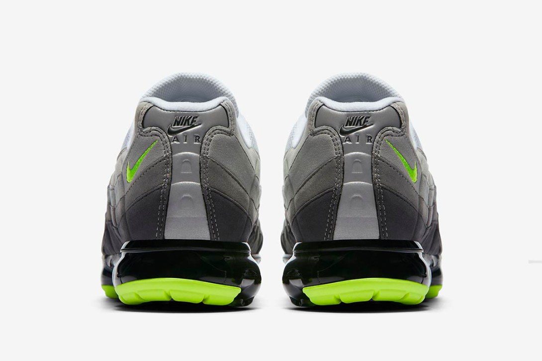 最先由 Vintage 店铺 Round Two 店主 Sean Wotherspoon 在其个人 Instagram 上曝光了全新「混血鞋款」Air VaporMax 95,现在 Nike 亦终于正式公布鞋款的官方图片与及发售讯息。Air VaporMax 95 首波配色将以 Air Max 95 经典的「Neon」配色为蓝本出发,在保留其经典灰色和应该绿色鞋面搭配的同时,搭载 Nike 近年超人气的 Air VaporMax 大底而成,鞋款将于 8 月 16 日上架,定价为 $190 美元,有兴趣的朋友请万勿错过。 |