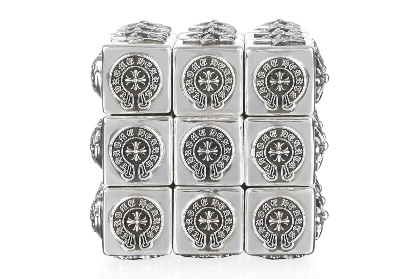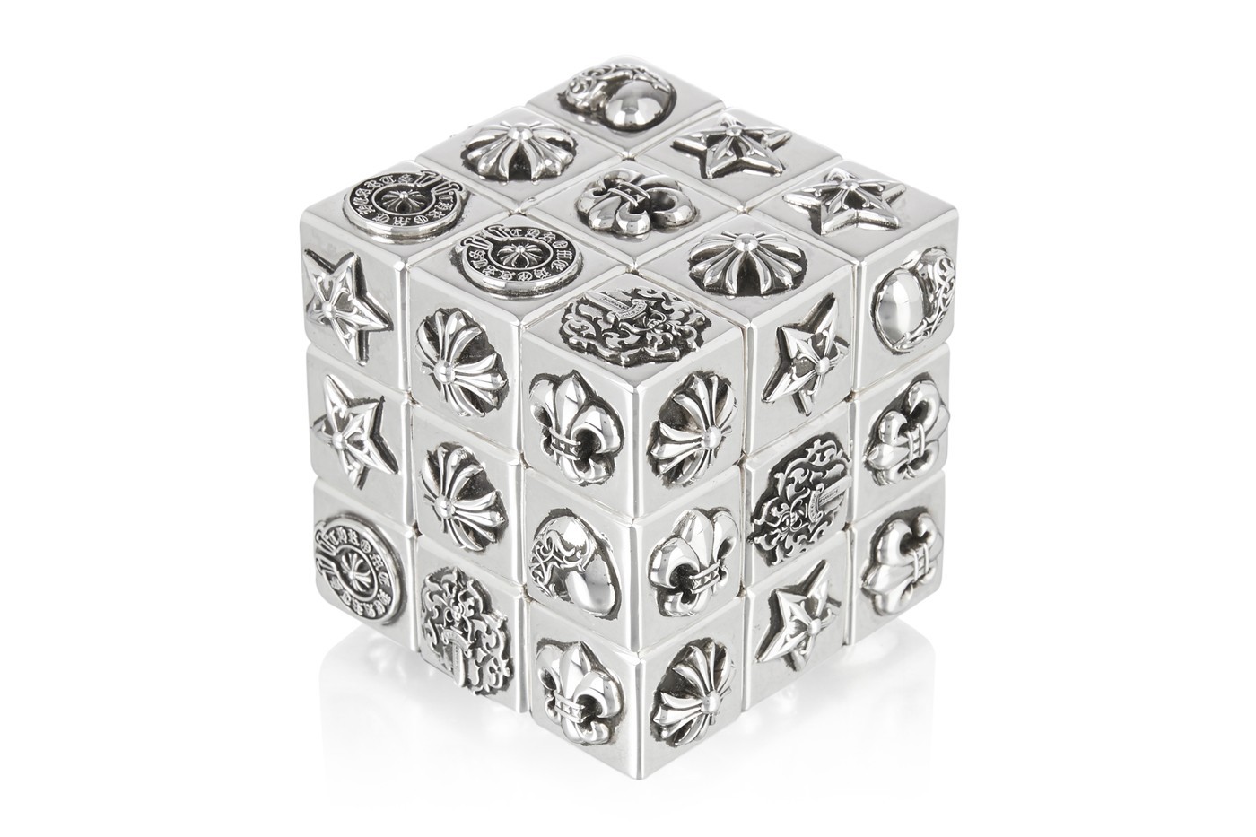 Chrome Hearts 在 2017 年时便曾带来一只 925 纯银制成的魔术方块,今回官方再度带回此话题配件,当中特地于洛杉矶总部生产,六个表面皆以匕首、心形、星形、横额、十字架和百合花饰等品牌标志性的徽标呈现,无论破解前后的整齐、混乱样貌,甚至如图片中转动至一半过程,在摆设上皆有不同风格。目前此款魔术方块已经登陆官网限时发售,售价 $6,600 美元,有兴趣的读者不妨多加留意。 |
