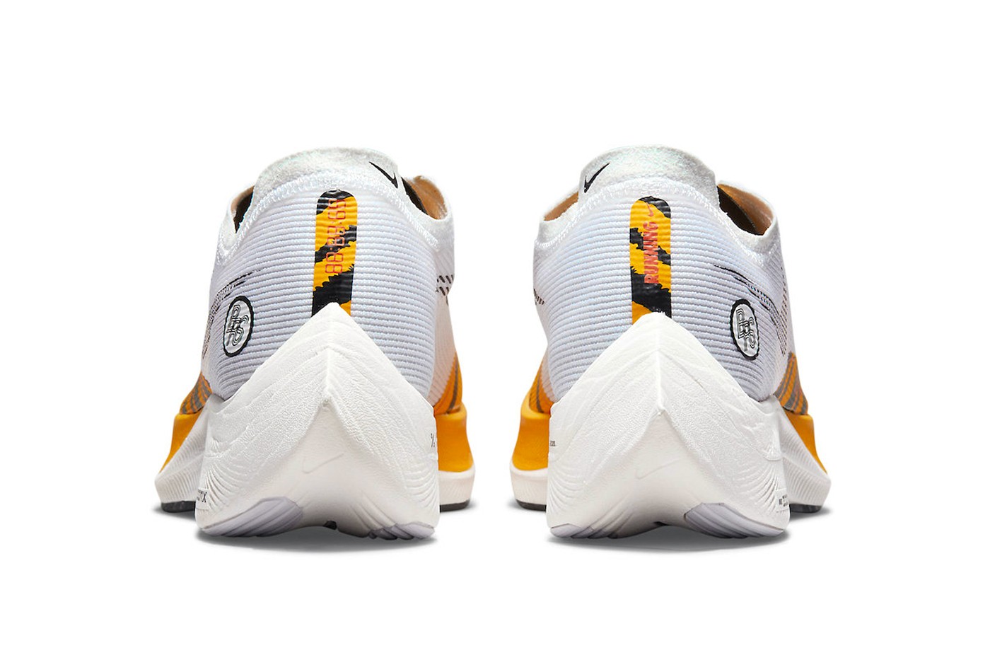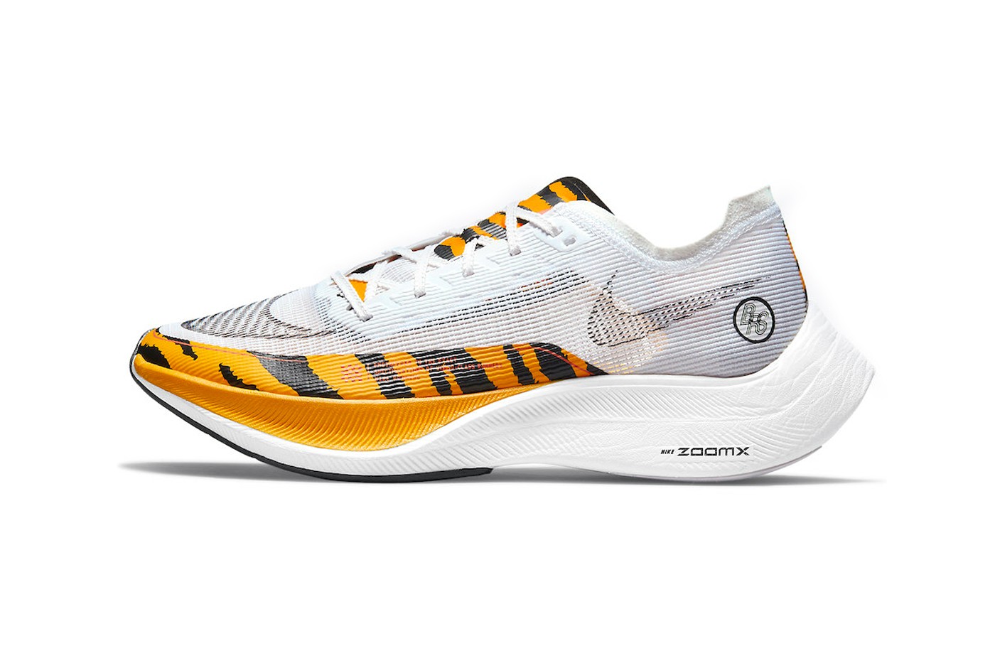 为向 1964 年 Phil Knight 与 Bill Bowermeach 共同建立的 Nike 前身 BRS(Blue Ribbon Sport)致敬,Nike 这回将当时的标志性花纹注入ZoomX VaporFly NEXT% 2 之中,打造全新的 Nike ZoomX VaporFly NEXT% 2 BRS 。 鞋款以白色特殊网眼材质构成鞋面搭配从内侧贯穿至前掌部分的淡黑色 Swoosh 标志,鞋头处、鞋舌以及后跟饰有黑色与金黄色交替的虎纹作为点缀,致敬 BRS 的主题呈现在后跟处「BRS」印章以及鞋垫上印有该公司地址,最后以经典全白 ZoomX 泡棉中底配合前掌碳纤维板外底增强鞋款提供穿者优质着用体验。 Nike ZoomX VaporFly NEXT% 2 BRS 售价为 $250 美金并将于未来几个月内发售,有兴趣的读者不妨持续留意。  |