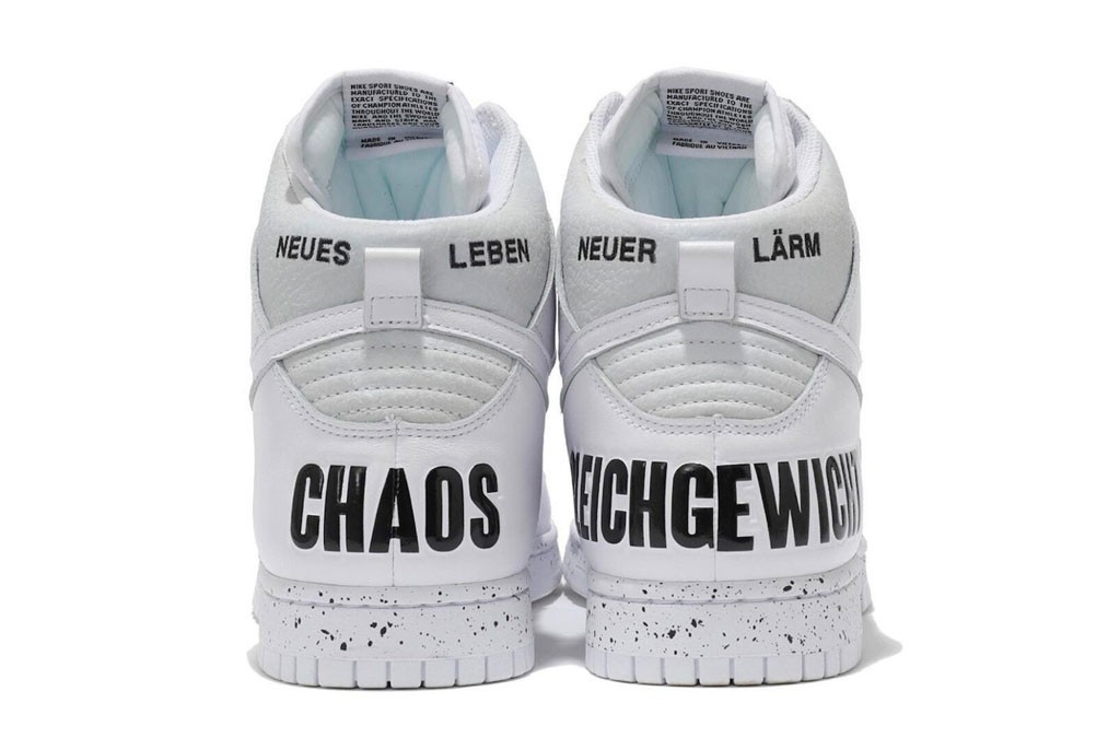 在黑色版本曝光之后,UNDERCOVER 与 Nike 的最新联名「Chaos/Balance」公布全白配色官方照片。 设计上同样以 1985 年元祖 Dunk High 为轮廓蓝本,除了光滑的白色皮革鞋面,亦采用突出的鞋舌设计,并在中底部分以黑色泼墨方式作为点缀。此外,鞋领后方与脚跟处饰有德语「NEUES LEBEN」和「NEUR LÄRM」、「CHAOS」、「GLEICHGEWICHT」等字样,意即「平衡」以及「New Life,New Noise」。 UNDERCOVER x Nike Dunk High 1985「Chaos/Balance」将于2 月 28 日开售,定价 150 美元。 |