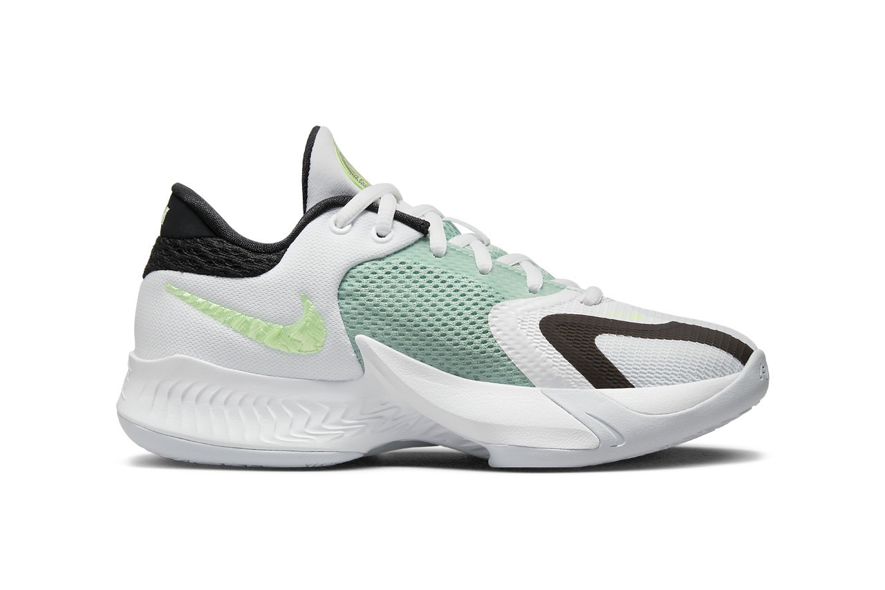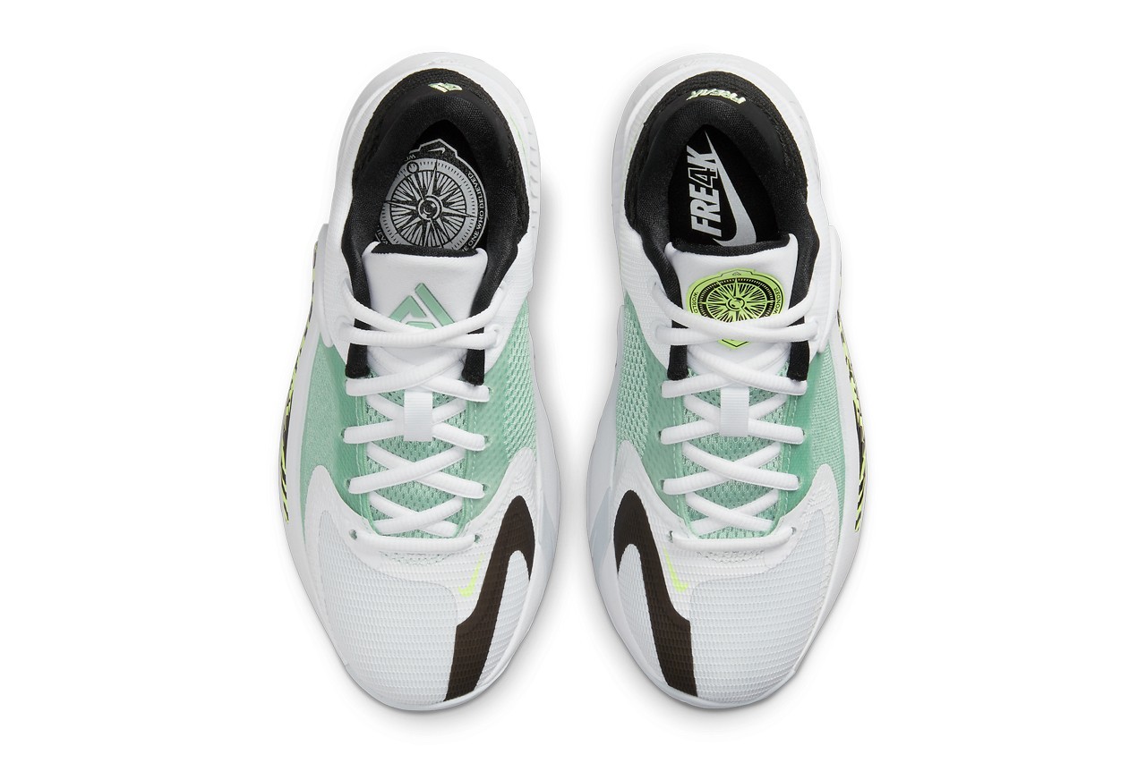 上月末已经率先带来 Giannis Antetokounmpo 最新世代签名战鞋 Nike Zoom Freak 4 的发布消息,很快今回官方就正式揭晓了此鞋型的首发配色「Barely Volt」。 全鞋采用低筒轮廓,设计上继承了 Zoom Freak 3 的多个元素,包括反向 Swoosh Logo 再次回归,且从鞋带系统一路延伸到中底位置,相当抢眼,并搭载 Zoom 中底缓震技术。而此配色整体则是以洁白色调为主轴,在鞋面中段位置、鞋侧 Swoosh、鞋舌徽标注入 Seafoam Green 与 Volt Green 配色。 需留意的是,上述图片为 GS 尺码版本,成人尺寸有待官方另行公布,有兴趣的读者不妨多加留意。  |