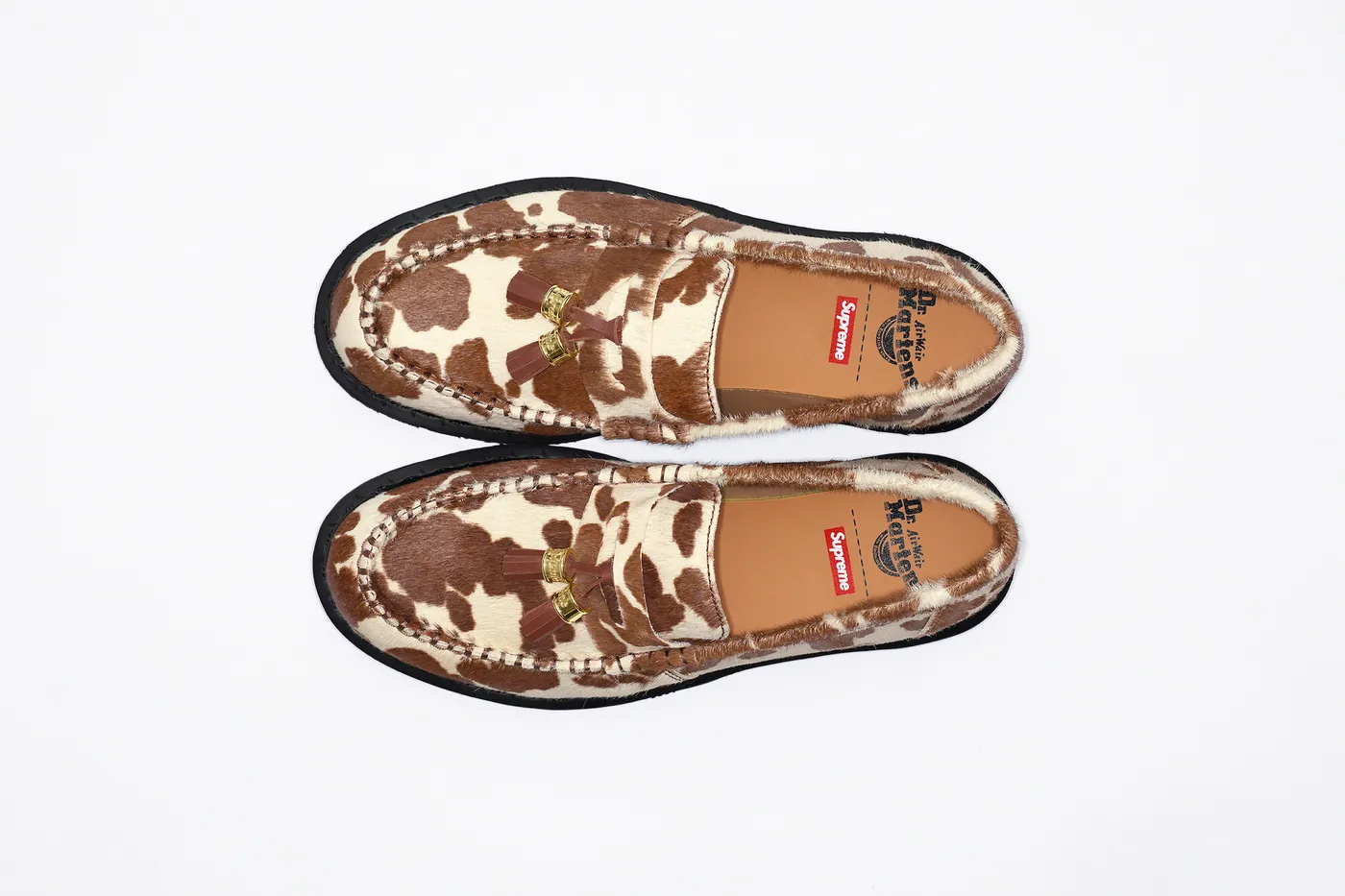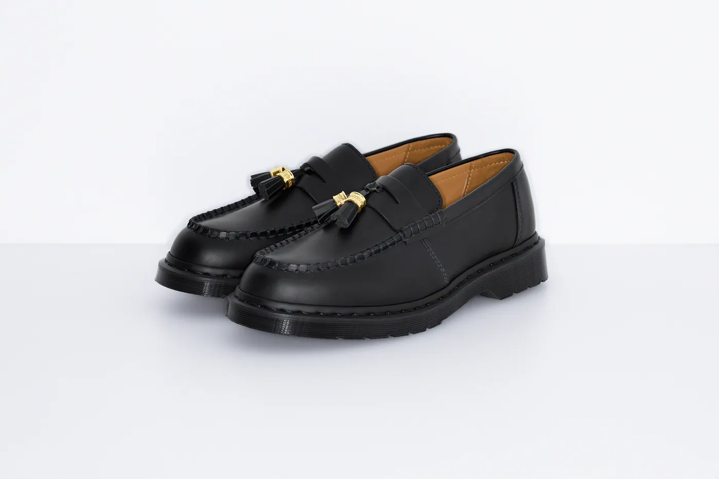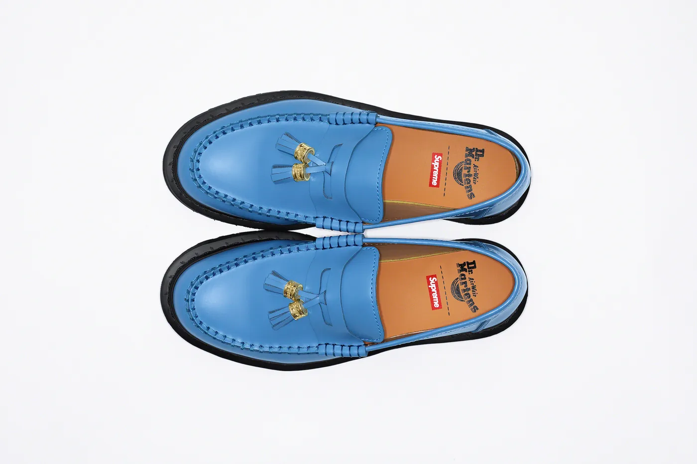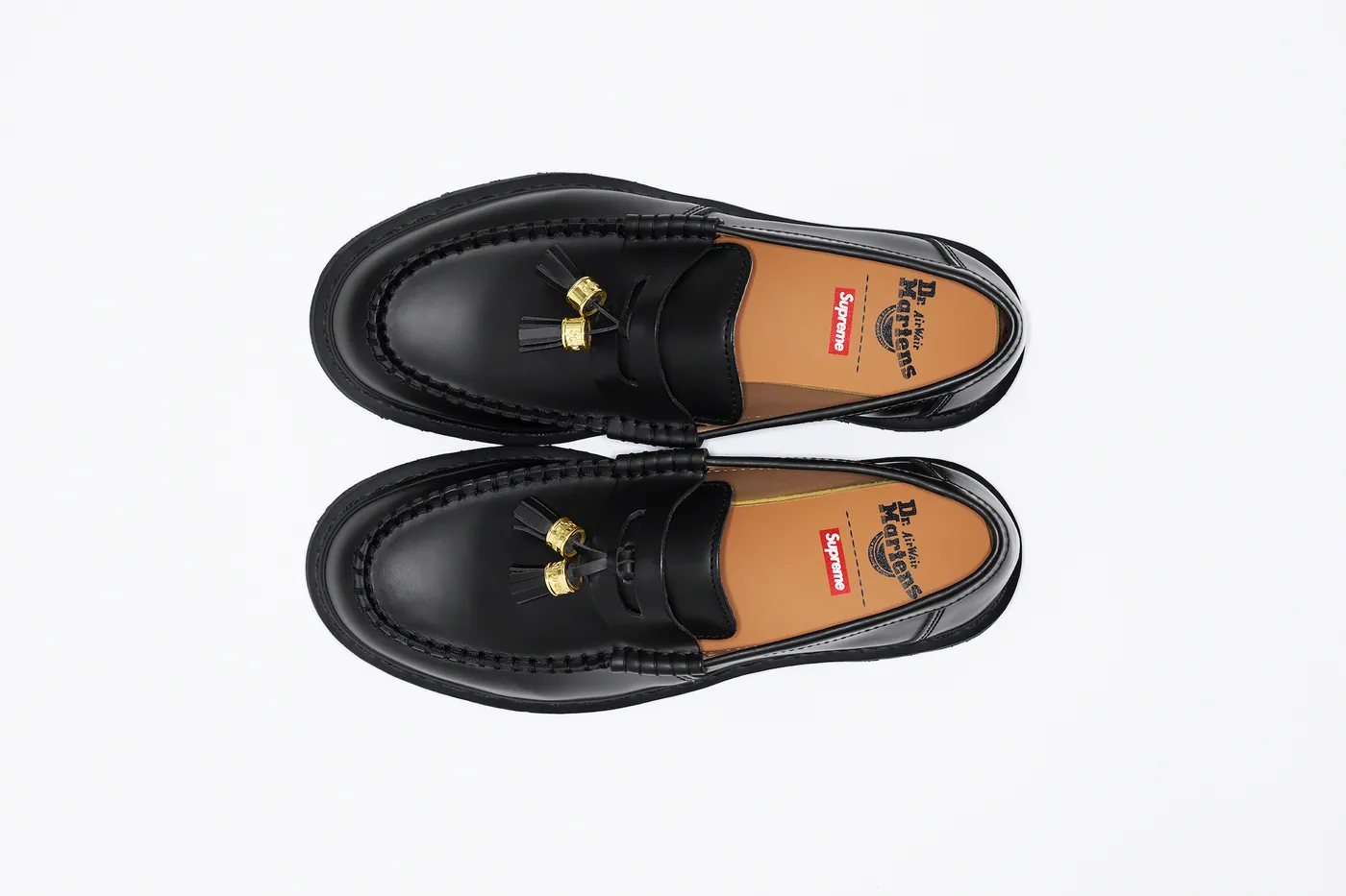 今日,Supreme 携手 Dr. Martens 发布全新联名鞋款,以 Dr. Martens 经典的 Penton 流苏乐福鞋为联名基底开发。鞋款采用复古光滑皮革鞋面和皮毛一体的设计,鞋底方面则采用 AirWair 缓冲气垫鞋底。值得留意的细节,是在流苏束带的使用上,用金色刻有「Supreme」字样的配件取代了全部的全皮设计。此次联名鞋款也共提供黑、蓝光面皮鞋,与白棕皮毛这三种配色。 据悉,该系列将于美国东部时间 4 月 6 日登陆 Supreme 美国及欧洲地区门店和官网,而日本地区则要等到 4 月 8 日,感兴趣的各位不妨持续关注。  |