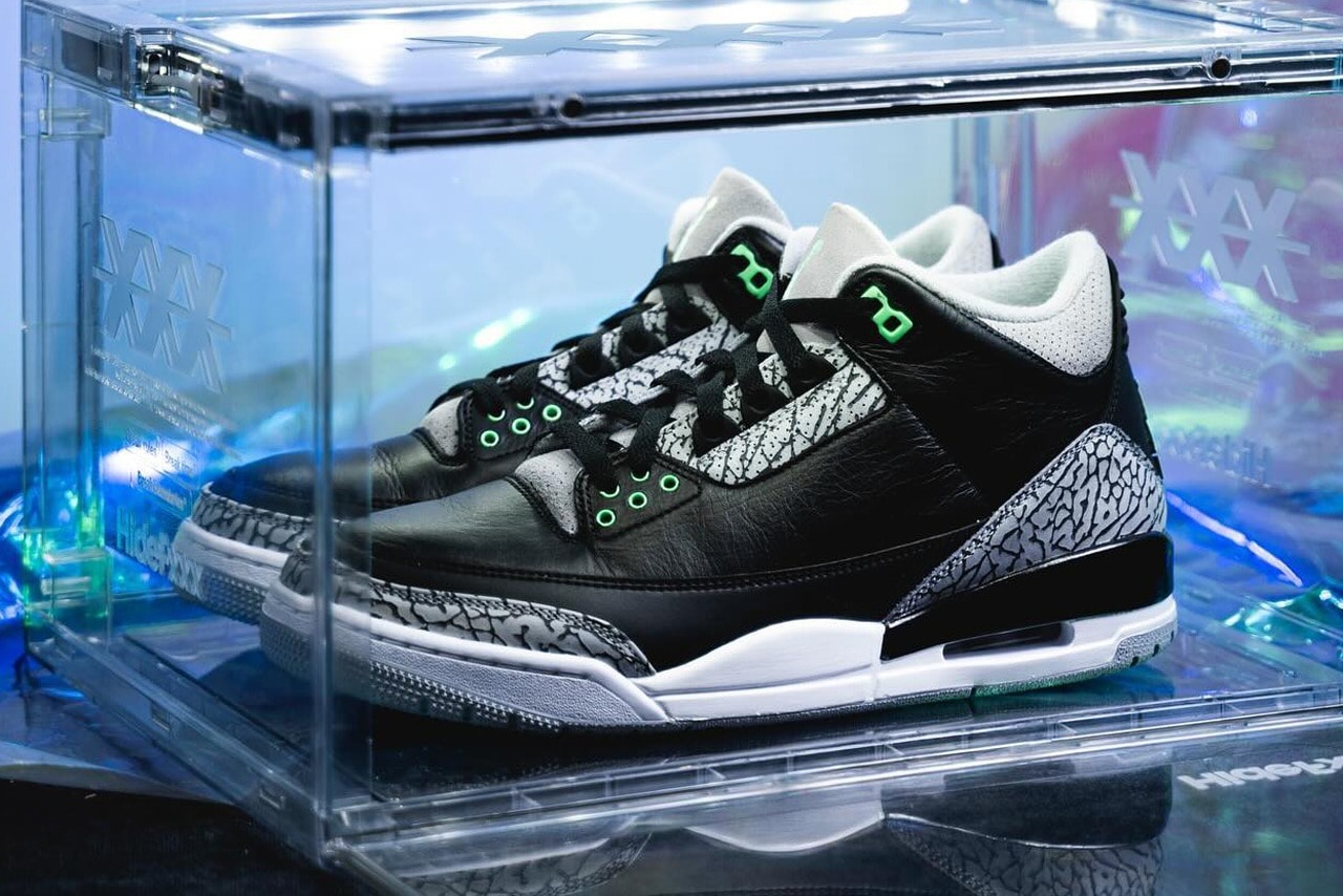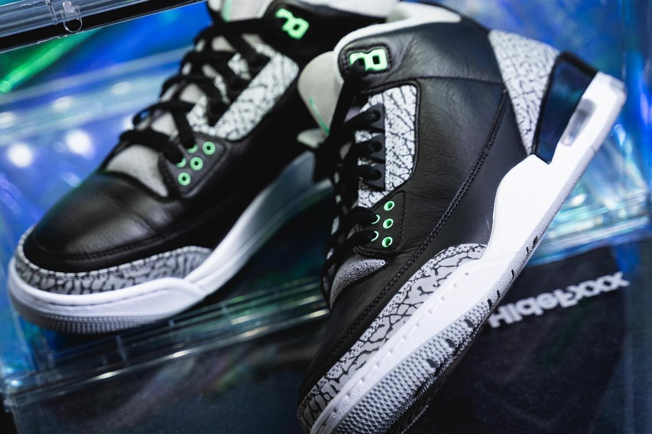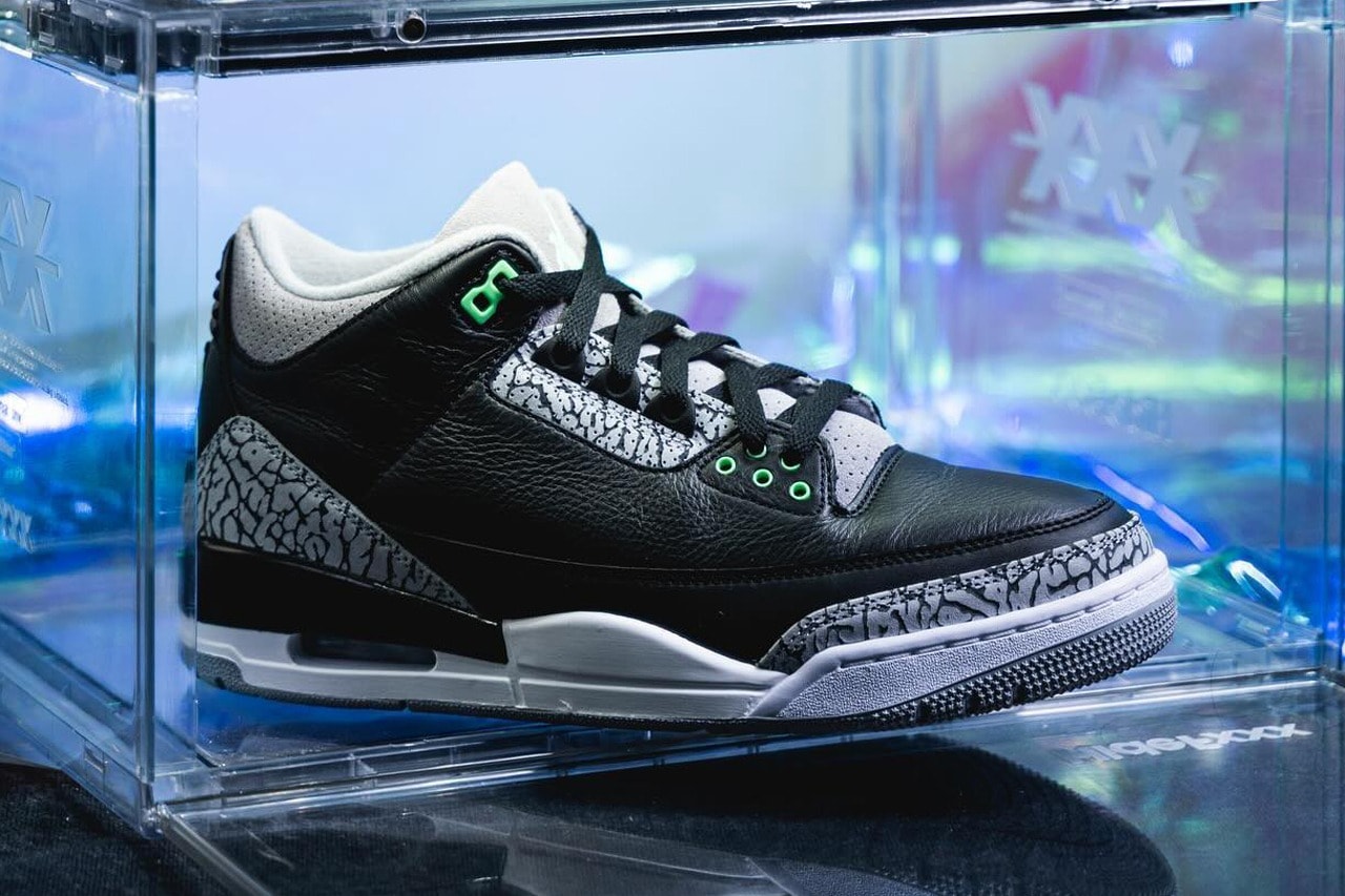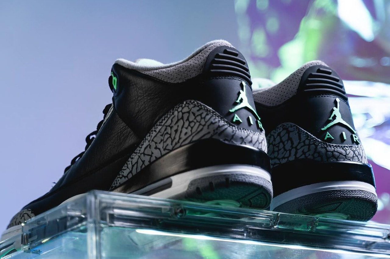 继先前推出 Air Jordan 3「Fear」、「Hugo」后,今回网上再曝光该鞋全新配色「Green Glow」。 今年适逢 Air Jordan 3 问世 35 周年,此次曝光的「Green Glow」延续经典的「Black Cement」配色,鞋身以黑色皮革与爆裂纹印花制成,鞋带穿孔、鞋舌和鞋后跟的 Jumpman Logo 辅以绿色点缀,让低调的配色增添一丝亮点,配上黑色鞋带,让整双鞋更加完整。 目前未有 Air Jordan 3 全新配色「Green Glow」的官方发售资讯,消息称该鞋将于 2024 年 4 月 27 日登陆 Nike SNKRS,售价为 $200 美元,有兴趣的读者不妨多加留意。  |