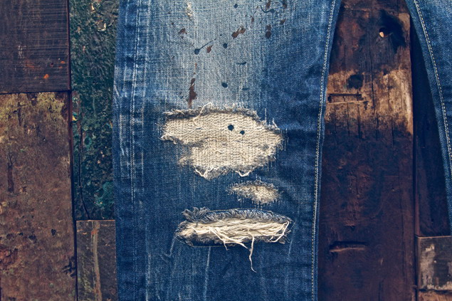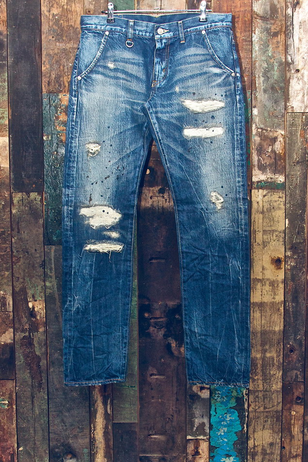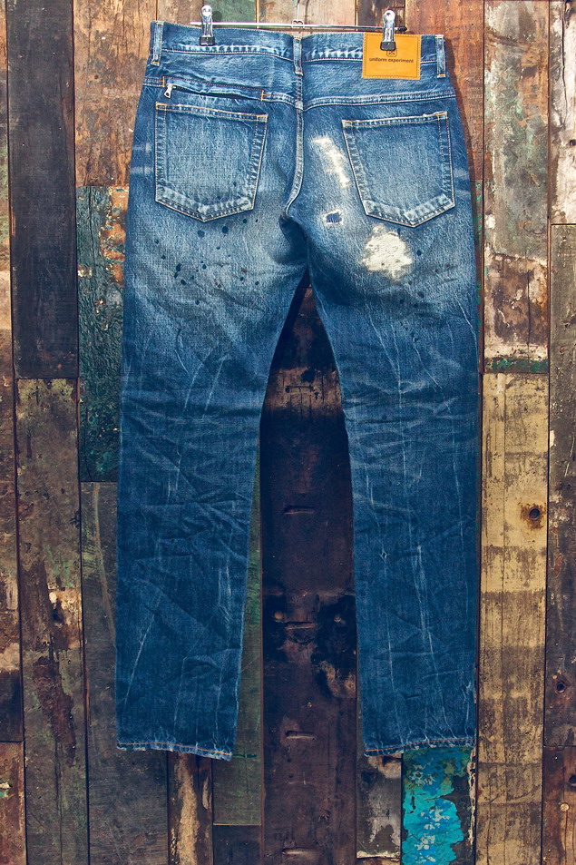 最后为大家带来的是Uniform Experiment 的MEDIUM DAMAGED PAINT DENIM PANT。选择他的原因是,该有的,他都有,而且造得很出色,不会过份污夸,自然程度当然及不人亲身操出来的牛仔裤。不论洗水,破烂,补强,泼墨,还有牛仔裤的灵魂﹣Redline 都一应俱全,而且洗水纹跟破烂位都造得尽量的自然以及合理。但凡经过藤原浩的手笔,总会有一些低调但奢华的位置会让你乖乖捣出小朋友来付款的,就是签名式的“D”字裤头扣了,在小小扣上还刻有精致的UE ogo,就这一点都值回点点票价了。 |