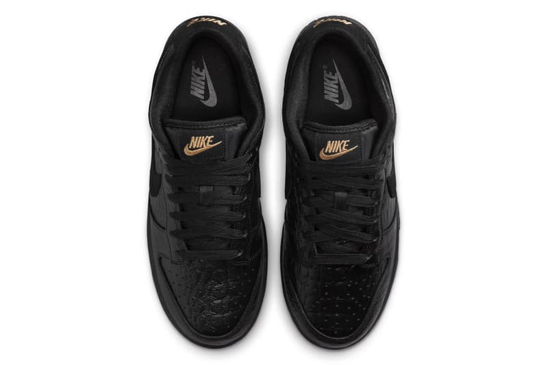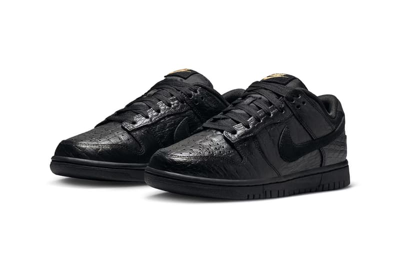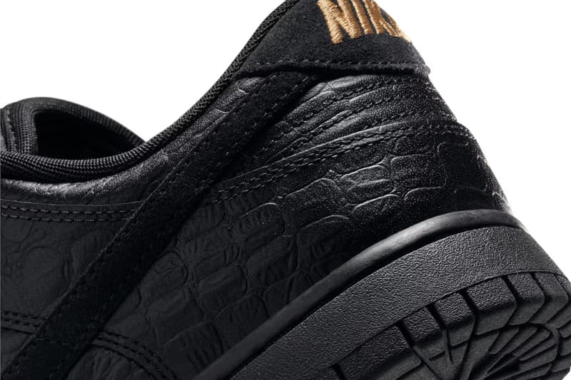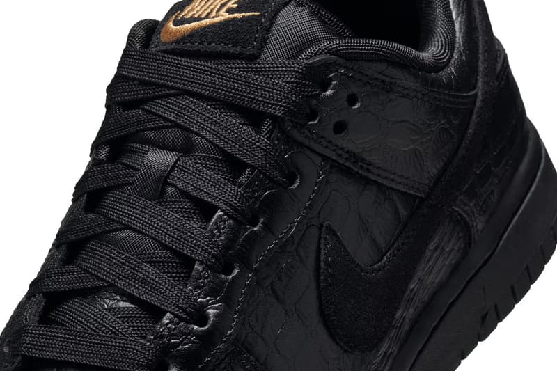 Nike 即将为这双长青人气鞋款换上奢华新装 ——Nike Dunk Low「Black Croc Skin」预计于 2025 年秋季载誉回归,以更精致、讲究的高级气息再度演绎经典;同时也进一步巩固 Dunk Low 在材质玩味与百搭属性上的口碑。 新作沿用 Dunk Low 标志性轮廓,全鞋以酷黑示人,从鞋面一路延伸至大底;最大看点莫过于覆盖鞋头、中段与后跟的亮面仿鳄鱼皮压纹。张扬纹理让球鞋瞬间脱颖而出,令日常 Dunk 摇身一变成为街头焦点。 为亮面鳄鱼纹增添层次感,鞋侧同色麂皮 Swoosh 与后跟鞋标换上哑光质地,营造细腻对比;经典尼龙鞋舌延续多重触感,鞋舌顶端及后跟再以金色 Nike 刺绣收尾,低调流露贵气而不喧宾夺主。配套同色中底与外底完整呼应鞋身,视觉更显干净利落。 |