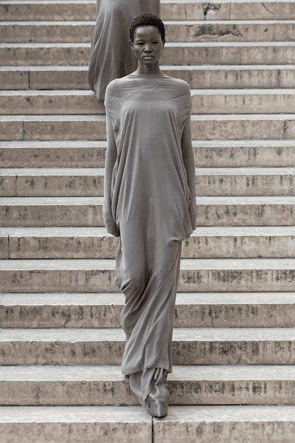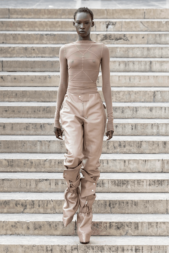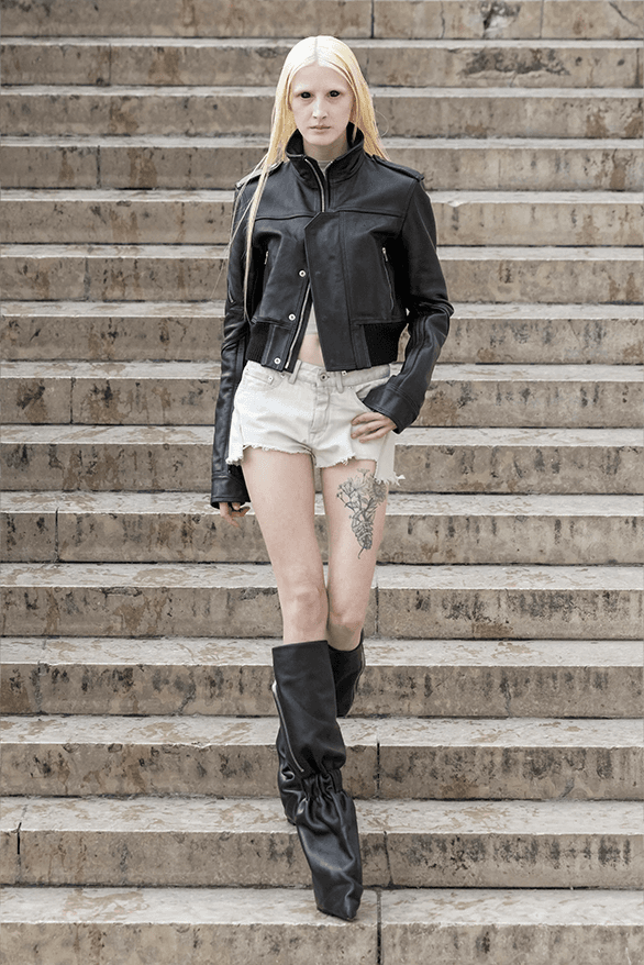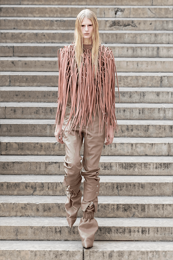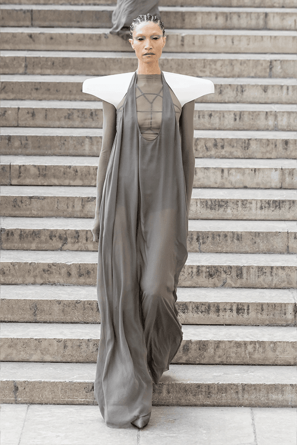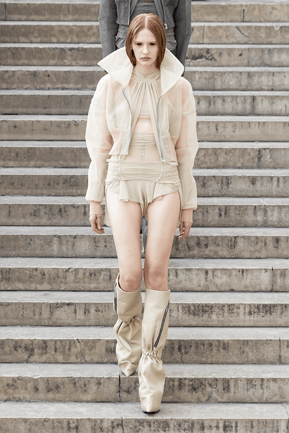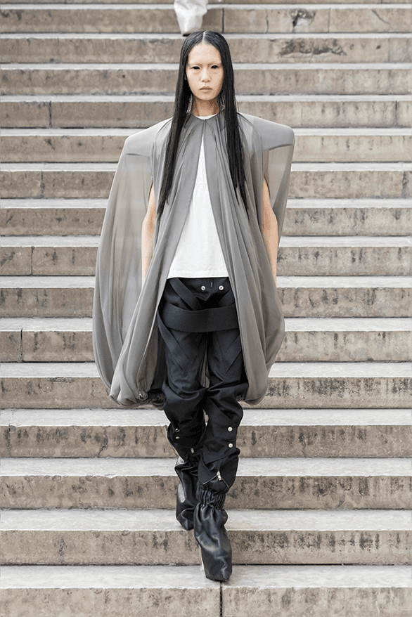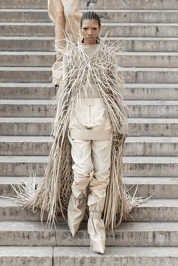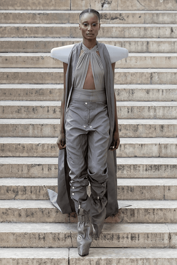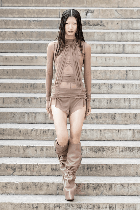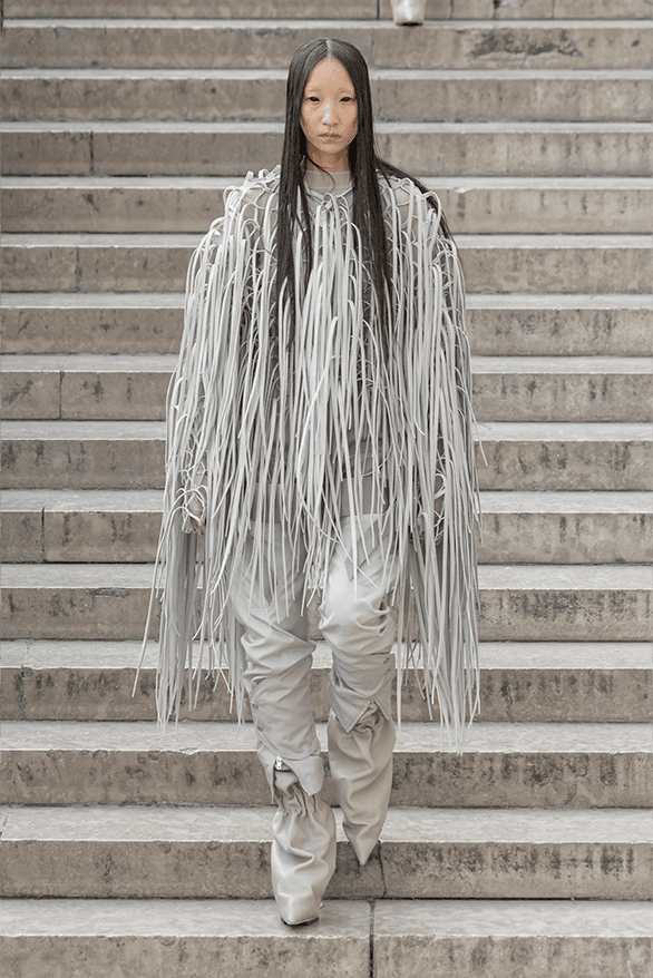 Rick Owens 为 2026 春夏系列打开「Temple」之门,将他跨季共享的男装与女装语汇合而为一。《Temple of Love》。 我们看到状态最好的 Owens:华丽与颓废并存,真挚与阴影交织。时装大秀于巴黎时装周第四晚在 Palais de Tokyo 上演,整个系列以他带有末日氛围的「美式直白」,把欧洲文化的典型意象重新诠释。 场刊警示:「艰难时局,穿上强韧的衣裳。」模特儿直冲喷泉、踏水而行,如同破碎世界的兵士。贯穿 45 套造型,Owens 更加巩固其暗黑符号:开场以网纱包覆的上衣束入皮革长裤,脚踩 Kiss Heels,拉链拉到极致贴合。 沿着阶梯下来的是一件如液态般流动的加长白色背心、胸前大开的轻薄连身裙,以及他已成为个人标志的扭曲突兀肩部插片。尼龙薄纱在 Matisse di Maggio 手中获得新生,以轻薄亮片点缀,呈现幽灵般的质感。毛绒罩衫在蓬松礼服与俐落皮革外套之间模糊界线,压轴造型则印有 Owens 手绘的星盘,为整场神话式叙事画下句点。 在上方图辑深入浏览 Rick Owens 2026 春夏系列细节。 |