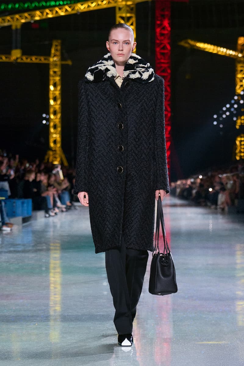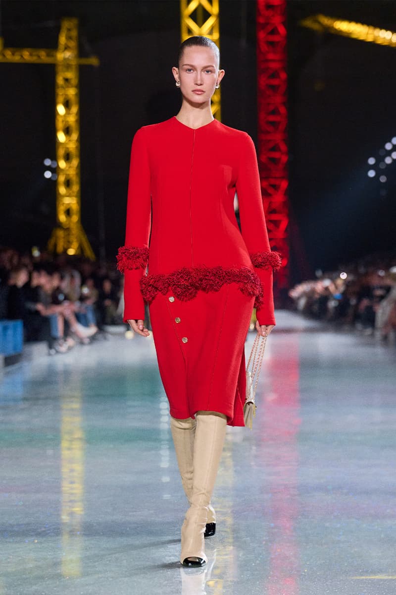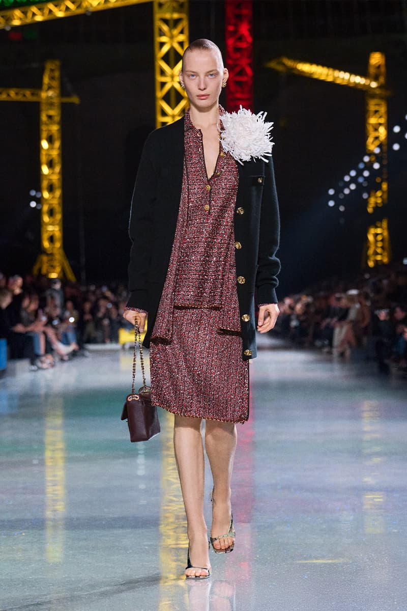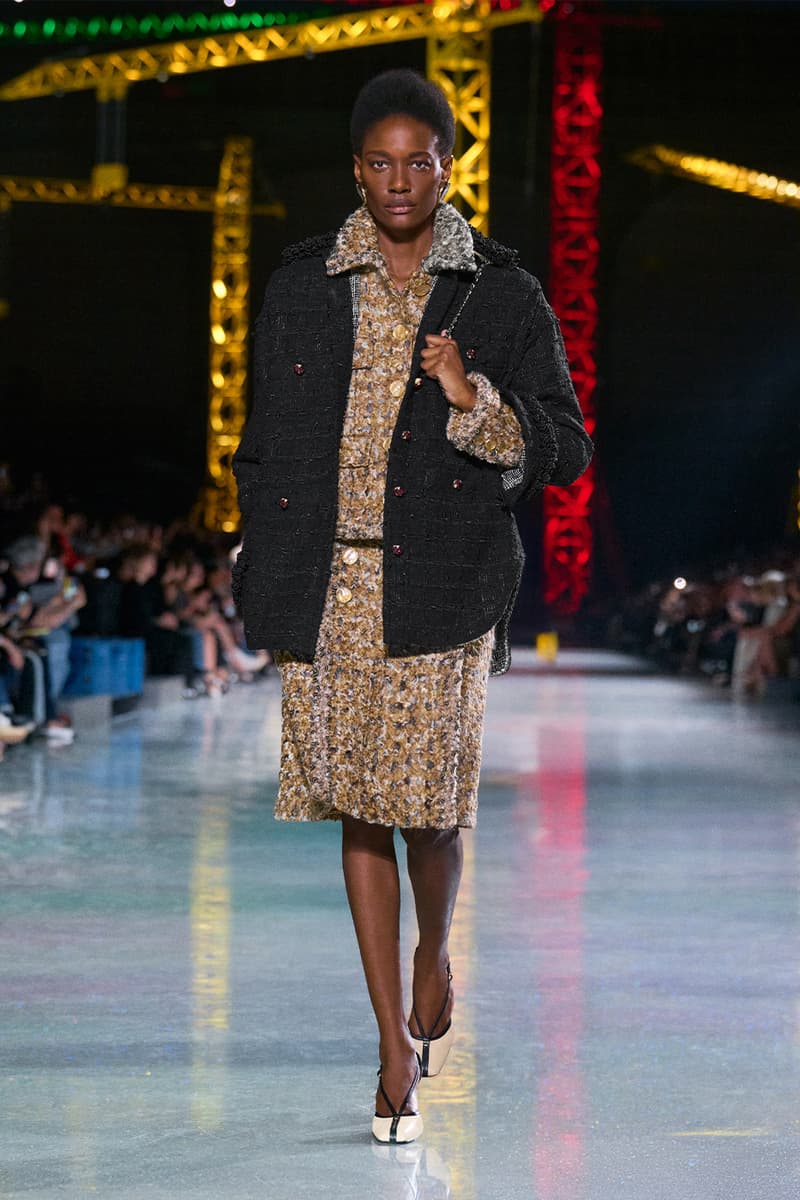 Matthieu Blazy 正式步入掌舵 Chanel 的节奏,而他最新一次的亮相清晰宣告:这家传奇巴黎时装屋,已在他的带领下迈向全新高峰。昏暗的大皇宫穹顶之下,缤纷起重机林立,Chanel 2026 秋冬大秀在此揭幕,化作一场关于「蜕变」的高超演绎。作为他接手后的第二个成衣系列,这位创意总监直接汲取 Gabrielle 「Coco」Chanel 的信条——时装应同时拥抱实用与幻想——优雅勾勒出一只脚踏实地的毛毛虫,如何蜕变成夜色中璀璨的蝴蝶。 FW26 系列的概念支点,是对 Chanel 女性内在悖论的凝练:理性却充满诱惑,于昼夜之间游走。「时装既是毛毛虫,也是蝴蝶。」Blazy 援引品牌创始人的名言,「我们需要会匍匐的裙装,也需要会飞翔的裙装。」为呼应这一理念,秀场以刻意克制开篇——脚踏实地、极具纪律感的日装占据 C 位:黑色针织拉链夹克、方正廓形的 overshirt 外搭、线条利落的压纹粗花呢短夹克轮番登场。Blazy 将标志性的 Chanel 套装重新想象为一块柔韧、当代的创作画布,推出更松弛的 twinset 组合,并加入品牌标志性的“work shirt” 工装衬衫,随性不束进下装,叠穿在经典夹克之下。 随着系列推进,最具张力的变化来自对比例结构的彻底重置。Blazy 大幅下移腰线,将腰带随意系在大腿中部,百褶裙摆则垂坠到远低于传统剪裁线的位置。由此勾勒出的全新廓形,仿佛是 1920 年代 flapper 女郎优雅风姿的当代翻译,经由现代日常视角滤镜后,显得更为松弛自在。 而当白昼渐次步入夜幕,整场秀在一片毫不收敛的虹彩光辉中全面炸裂。仿佛化身为隐喻中的蝴蝶,晚装章节呈现出近乎高级定制水准的惊艳工艺:耀目的亮片格纹套装、缀满珠饰并以星图刺绣流光溢彩的大衣,以及以金属网布编织出经典粗花呢纹理的造型,彻底接管了伸展台。成片绽放的立体布艺花朵、顺势拖曳的飘带与细腻的蕾丝贴花,将服装化作流动而充满张力的艺术装置,逼迫所有视线为之停驻。 为了让这场蜕变更加完整,配饰与妆容则一脚踏入奇幻领域。模特们梳起醒目的银色发髻,叠加厚涂闪片与淡彩假发,与那一双双马卡龙色、如第二层肌肤般贴合的小尖头拼色长靴默契呼应。皮具同样玩味十足:一只米色麂皮翻盖包,灵感源自 Gabrielle Chanel 传奇 Rue Cambon 公寓沙发上的 matelassé 菱格软包工艺,身旁则点缀一只奢华耀眼、泛着虹彩光泽的石榴造型 minaudière 盒子包。 在日常实用与张扬华丽之间搭起桥梁,Matthieu Blazy 为 Chanel 的未来勾勒出一个既诗意又雄心勃勃的蓝图。FW26 系列无疑证明,这家历史悠久的时装屋仍在持续构筑、不断进化,而更重要的是——它已蓄势待发,准备再度振翅高飞。 |
