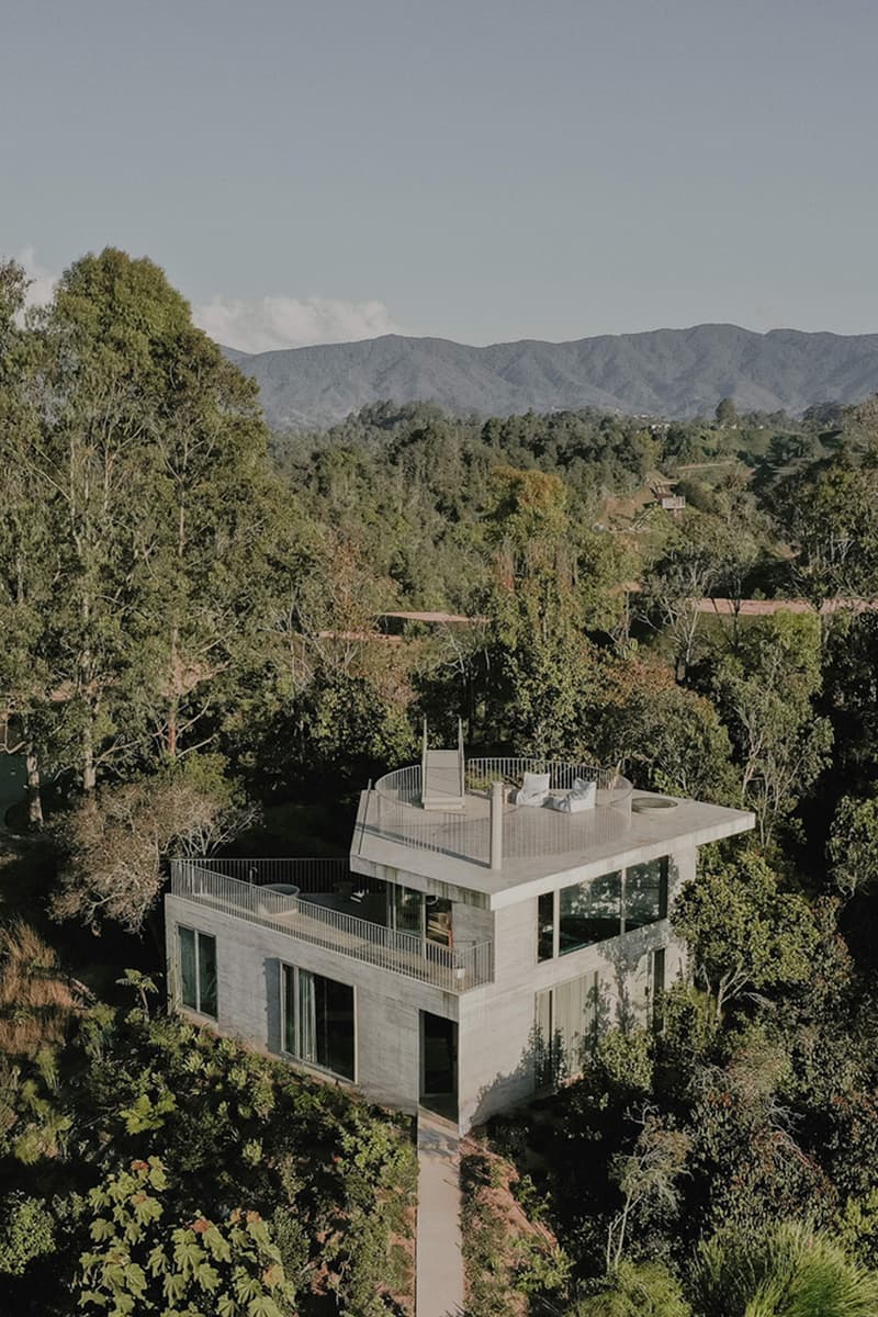坐落哥伦比亚山巅,由 Atelier Garcia 打造的「Concrete House」既是观景台,亦似从岩壁雕出的庇护所,全栋以原色清水混凝土筑成,朝向瓜塔佩巨石(Rock of Guatapé)及其水库。三角形平面顺应地势角度,拉出三条动线,串连三个互相咬合的层级 —— 与花园相连的贴地基座、框景远方的通透上层,以及全开放的屋顶平台。层层递进的配置,在景观导向的清晰脉络中拿捏出私密与开放的微妙平衡。 功能与结构亦沿着这幅蓝图展开:下层收纳隐蔽的私人空间,只在面向林坡与花园的位置开窗;自由无拘的社交空间则占据整个上层。屋顶由三组雕塑般的支撑体撑起 —— 三角形壁炉、暗藏厨房收纳的矩形立柱,以及配以天窗的圆形楼梯井。压缩与释放、实用与雕塑之间的节奏,打造出平静内敛的室内氛围,让自然景色成为画框内的唯一主角。 动线沿有机坡道而上,经由一道桥梁接连主体量与圆形屋顶露台,奉上无遮挡的 360 度全景,并强化建筑与环境之间的「三重对话」。透过几何重叠与互扣,设计呈现抽象而清晰的构图,于室内私密与广阔全景之间流畅切换。素材层面,沉实的混凝土基座与漂浮屋顶进一步巩固建筑与场地的连结,以克制的线条衬托周遭壮阔景观,实现从室内延伸至天空的无缝过渡。  |
