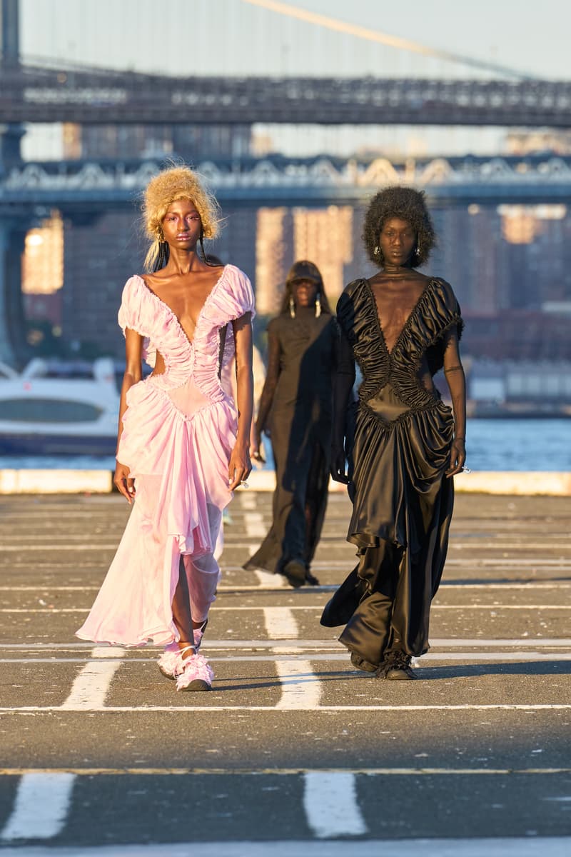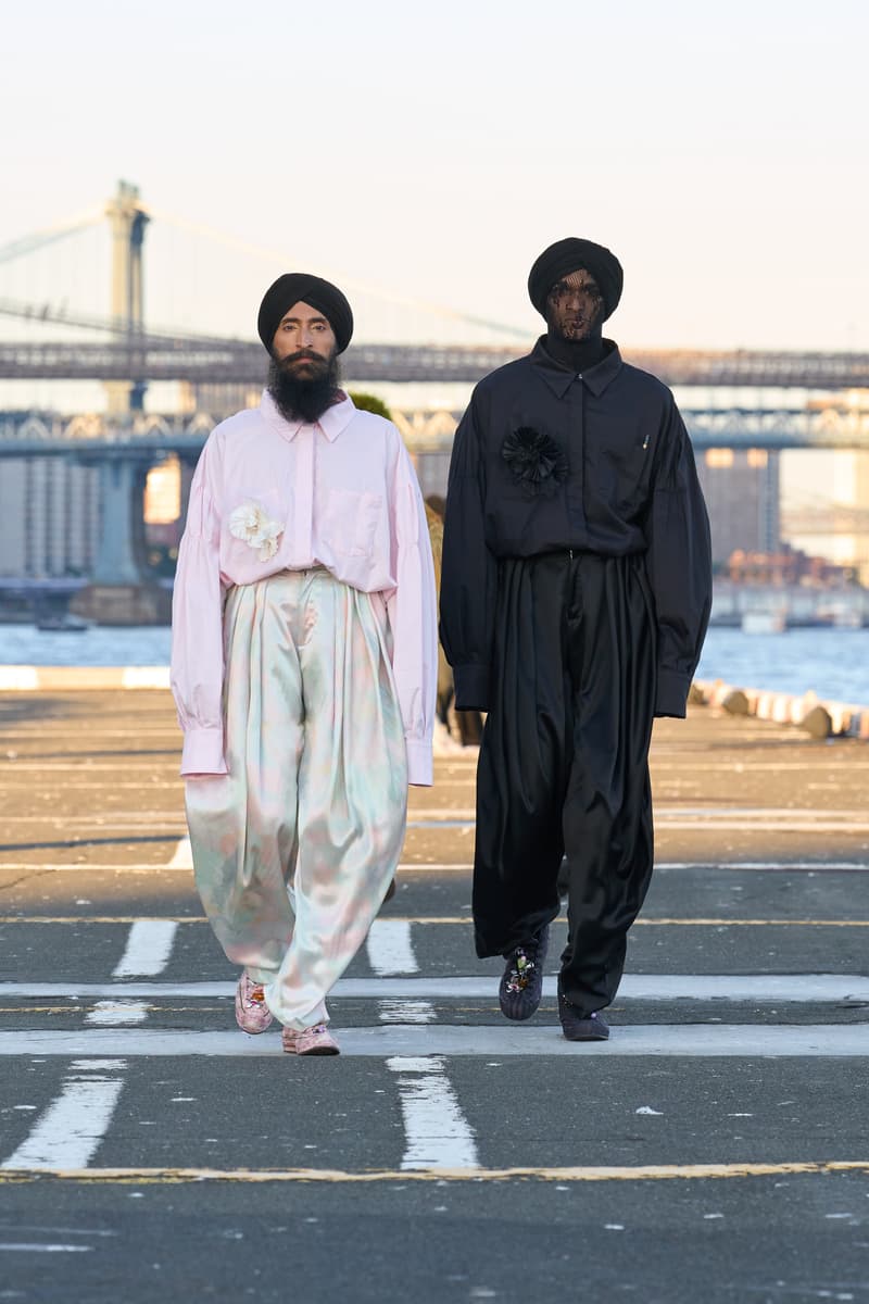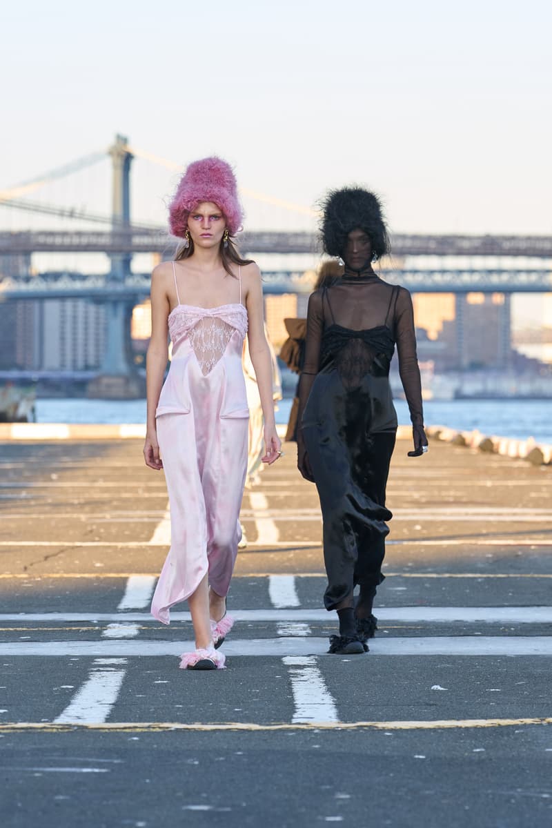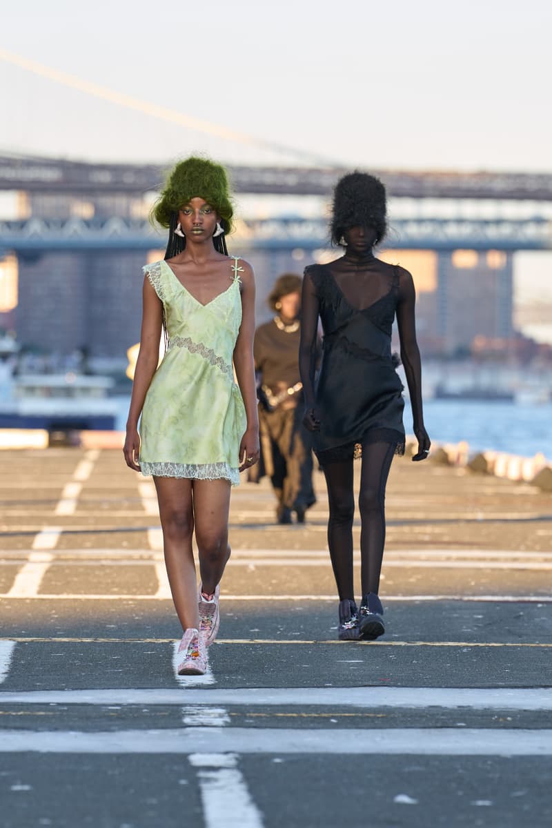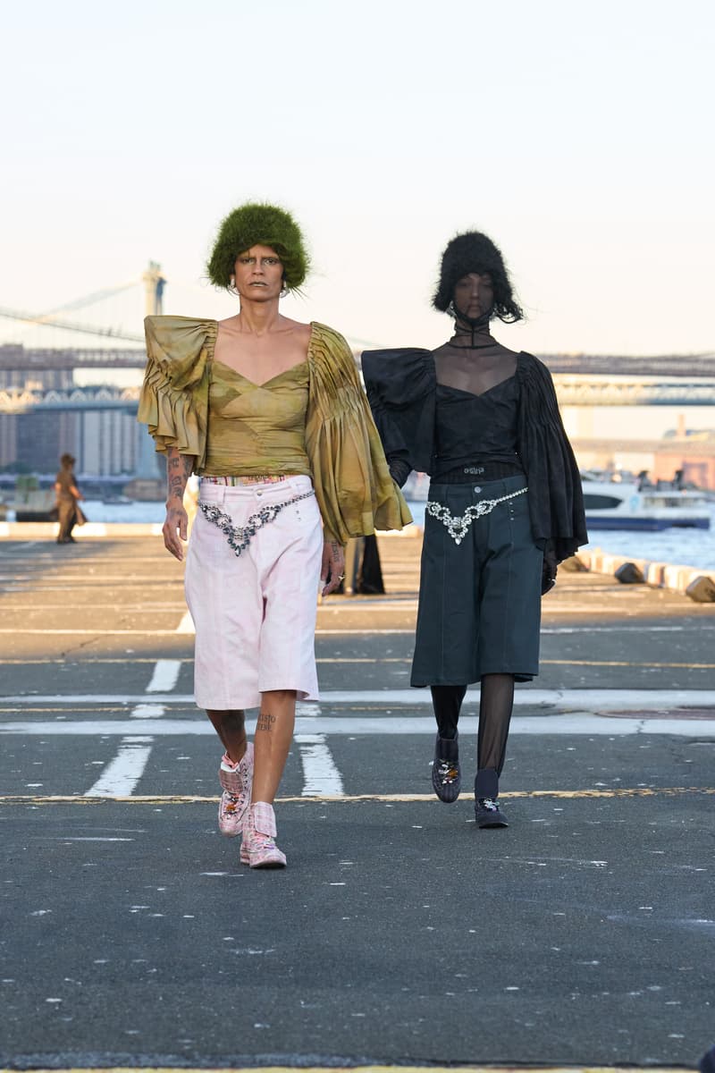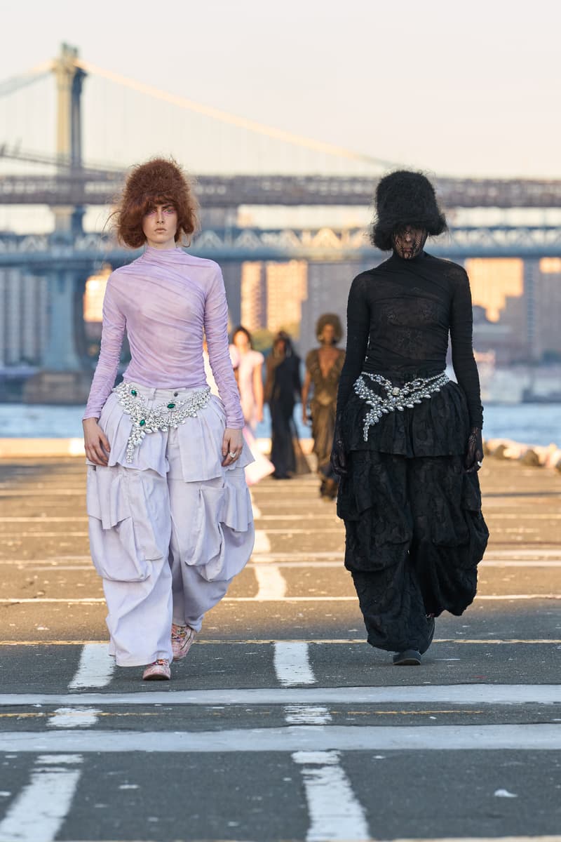 在 Hillary Taymour 手中,Collina Strada 每一季都围绕一个鲜明的叙事母题展开。2025 秋冬系列塑造出势不可挡的「Fempire」,2025 春夏则在最需要疗愈的时刻呼吁大家「Touch Grass」。来到 2026 春夏大秀,Taymour 锁定的抽象主题,比以往任何时候都更贴合当下脉搏。 本季以「Shade」为题。Taymour 早在「Save the Date」预告卡和正式请柬上便埋下伏笔 —— 卡片上印有皮影戏剪影,让嘉宾们在东河直升机坪排起长龙,揣测这抹怀旧意象将如何登陆秀场。 很快我们发现,在水面映出绚烂落日余晖之前,我们,其实就像一群皮影;更妙的是,秀场的编排也呼应了这一点。模特成双登场,一明一暗,「本尊」身侧紧跟其「影子」。所有 Collina 招牌的粉彩造型,都对应一套纯黑的镜像剪影。 Taymour 表示,她想捕捉光暗之间的二元张力,并透露日落景象正是她打造新系列的灵感源头。 「这一季讲的就是光与暗的双面性,以及如何在至暗时刻依旧散发自己的光芒。」秀后她补充道。现场伴随〈Friendly Fascism〉的音轨,薄纱轻覆的「光」造型走在前方,后面紧跟着由面纱、垂坠布料与大量面部蕾丝构成的「暗」造型。 两组造型共享的细节包括真人发编织的帽款、Converse x Collina Strada 高筒球鞋,以及各式死库存面料的再造应用。 「这关乎质疑外界灌输给我们的观念,在别人试图说服我们之前,用自己的头脑判定并走出属于自己的道路。」Taymour 说。同时她携手 OnlyFans 推出「Level Up」联名 T 恤。 在荣格一句名言的指引下,Collina Strada 2026 春夏系列不仅提醒我们每个人都有影子,更鼓励大家与之「和解并点亮」。 毕竟,「我们的影子终将与我们同行」,哪怕是在东河的直升机坪上。 |