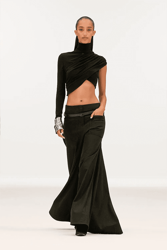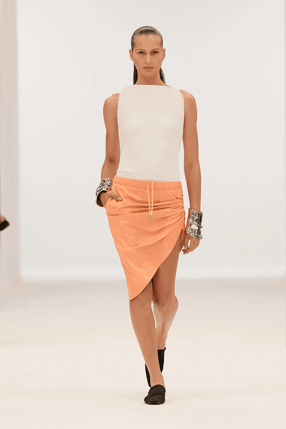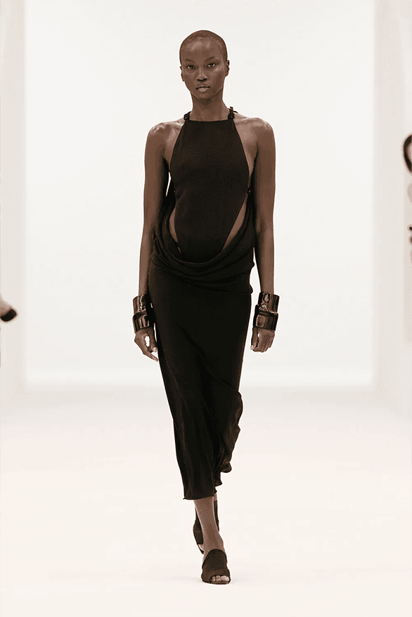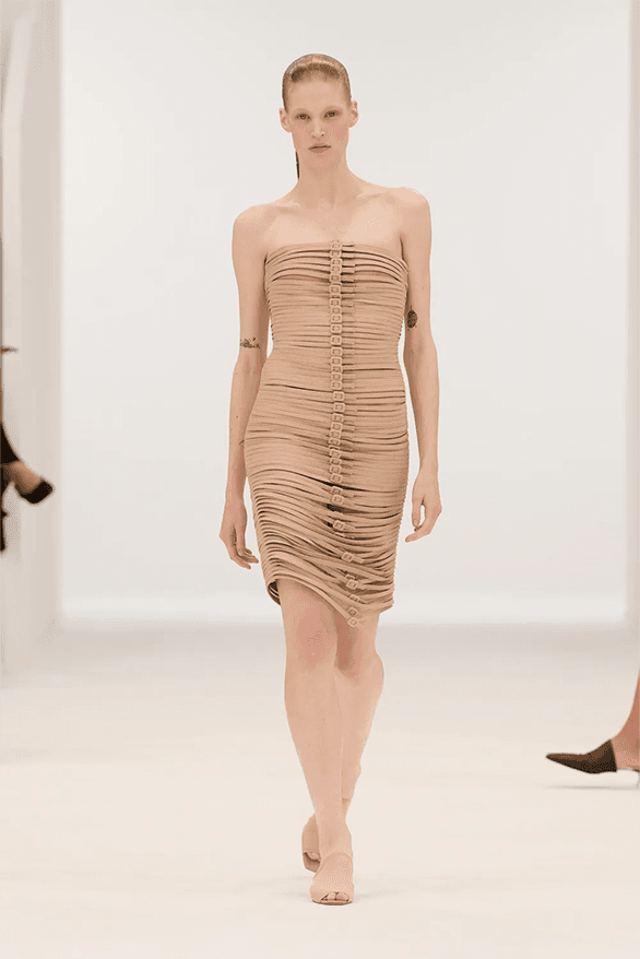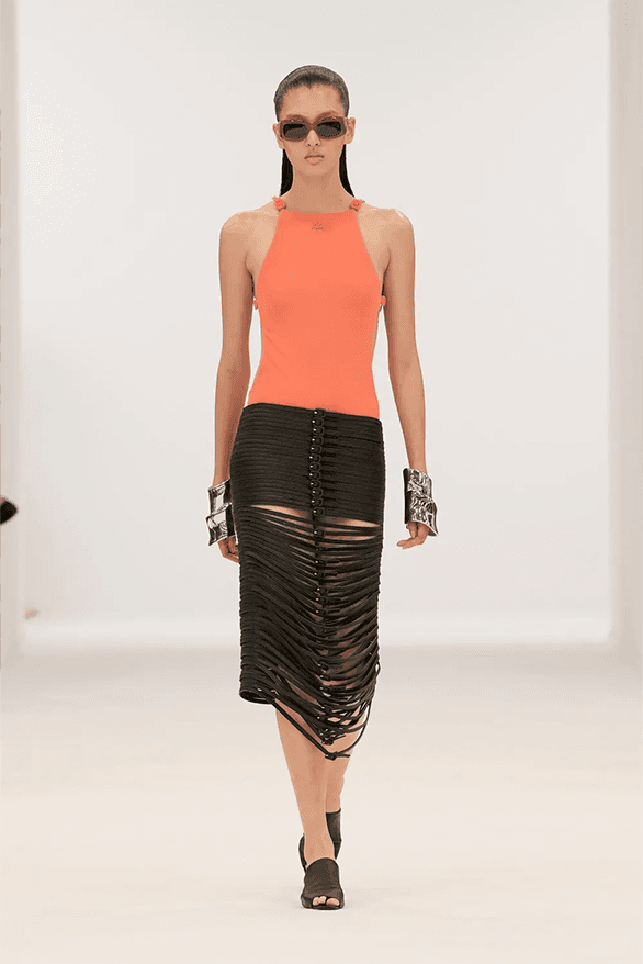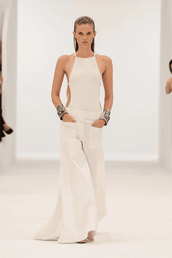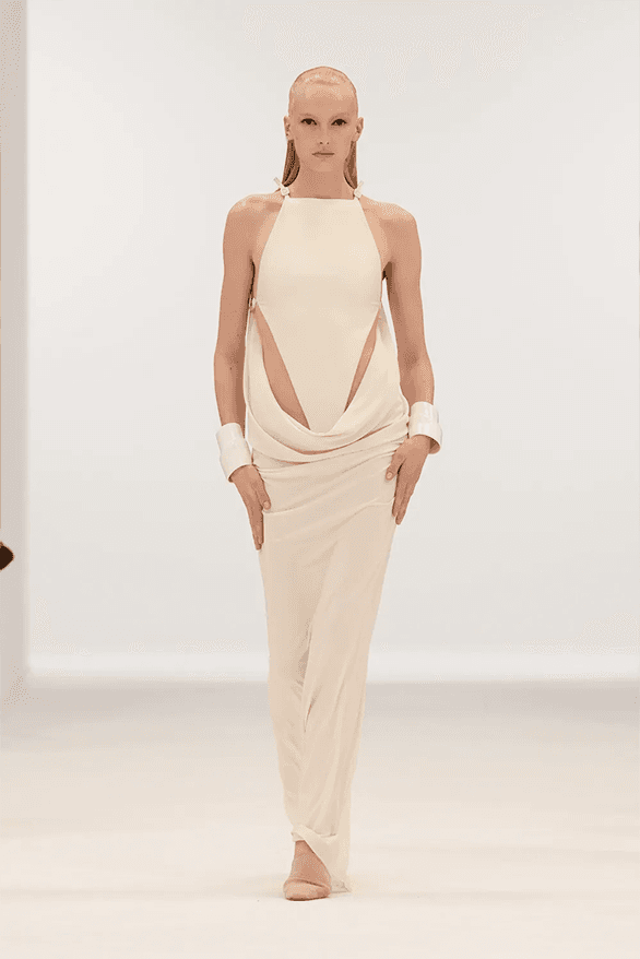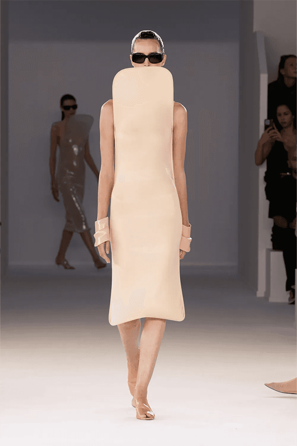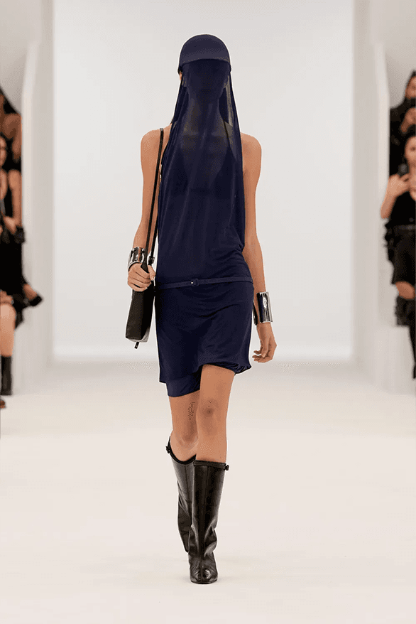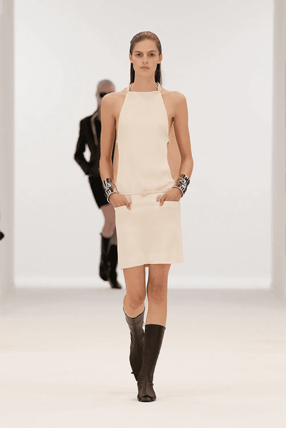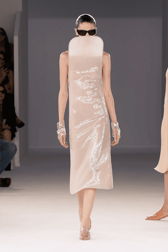 Nicolas Di Felice 掌舵下的 Courrèges 再次证明他是工艺上的巨擘,以循序递进的光感完成 2026 春夏系列。巴黎时装周第二天下午,品牌抛开常规,像日相变化般逐层推进张力,整场从闪耀到凝炼,直接把秀场推向「太阳域」。 Courrèges 的标志性方形场地,经 Rémy Brière 与 Matière Noire 重新设计为圆形舞台,为一场以「热/光」循环为核心的秀场叙事铺路。巴黎作曲家 Erwan Sene 用一段近乎催眠的配乐,像控温仪般推升场景张力——从冰冷到灼热,秀场温度自 22 ℃ 缓步攀升至 30 ℃,而那些柔中带硬、雕塑感十足的轮廓成为温度的视觉折射。 秀场以温度分段叙事:22 ℃ 的章节仍带寒意,青绿与深海军蓝渗入薄纱上衣、裙装与罩纱帽;24 ℃ 时段把泳装、格纹下装、皮革外套与混合材质鞋款揉合,轮廓从海滩过渡到城市;到了 26 ℃,灯光如正午,挖空 Bomber 夹克、紧密呼应的 Co-ords 套装与流水感晚装被完全照亮;最终 30 ℃ 把金属配饰与光泽面料定调,植物基 Vinyl 的割裂剪裁单品呼应当前脆弱的气候现实,而经漂白处理的连身裙以遮面设计在刺眼光束下为整场收笔,紧迫感与光耀同时抵达高潮。 向上滑动图辑,近距离细看 Courrèges 2026 春夏系列。 |