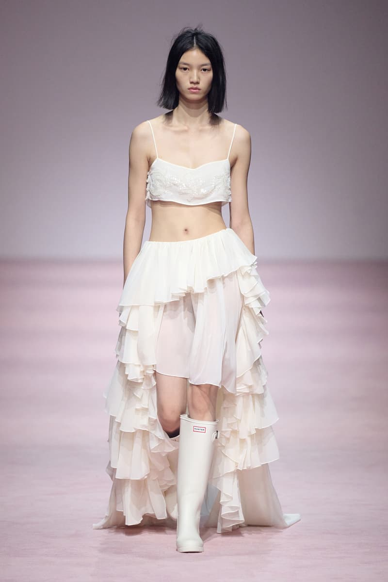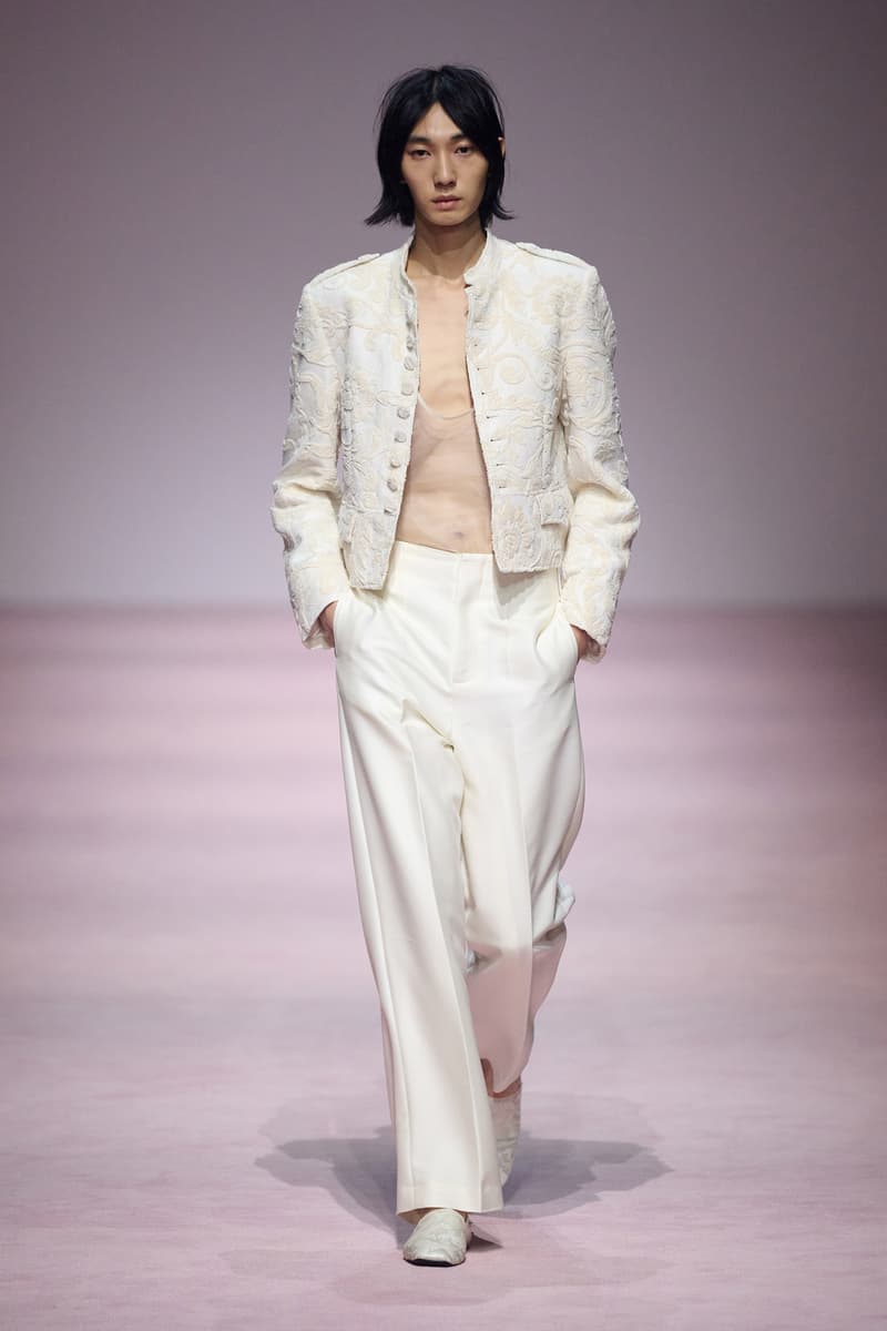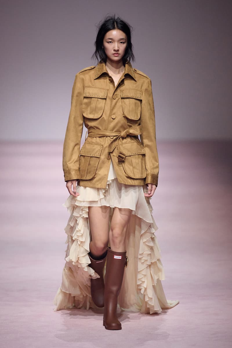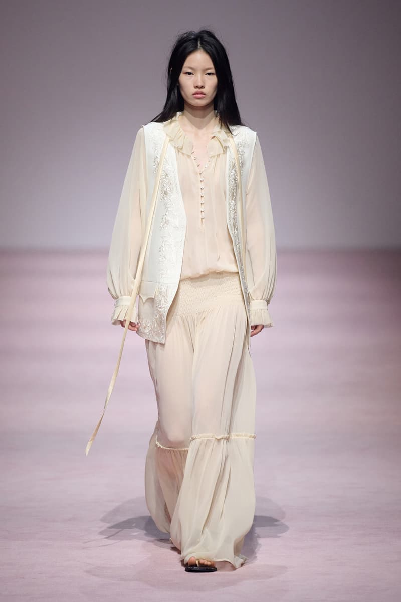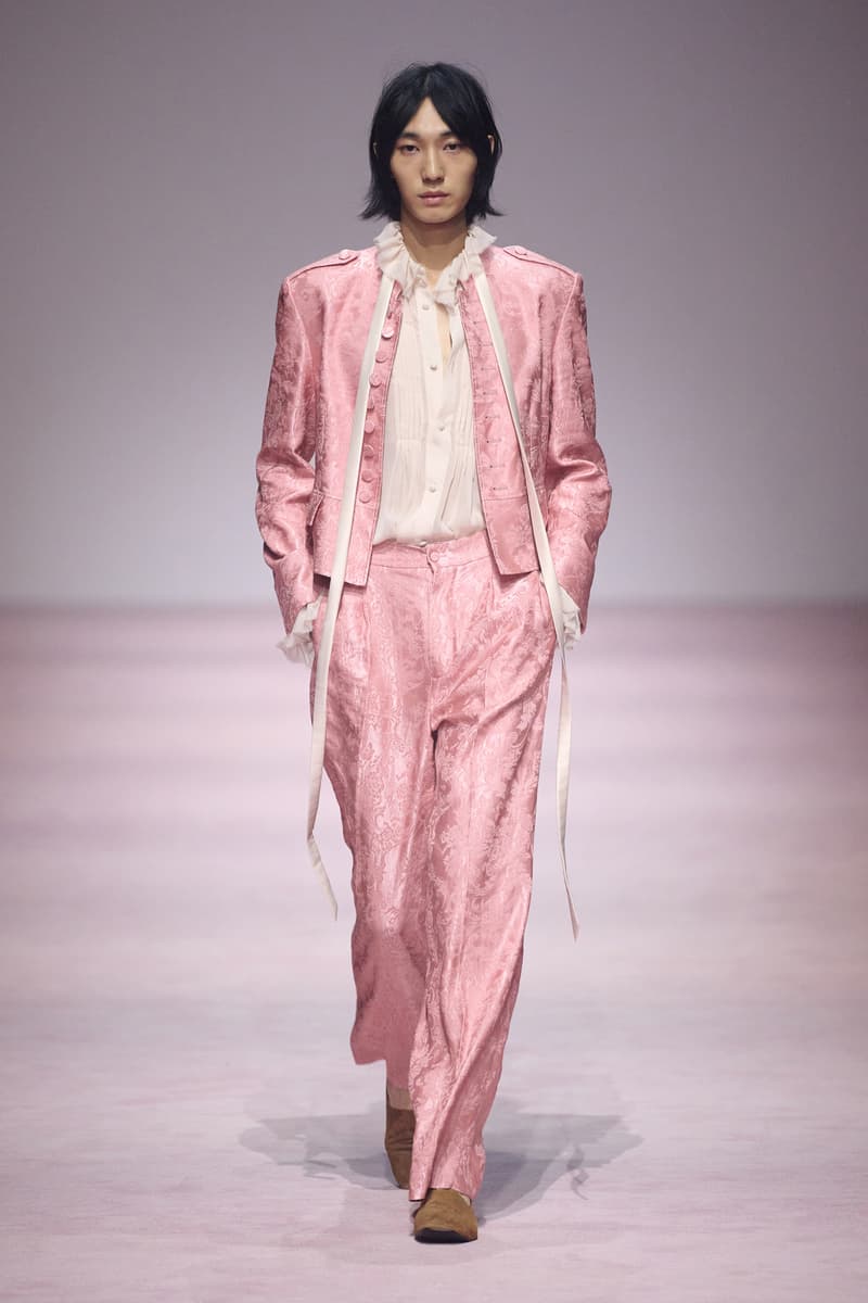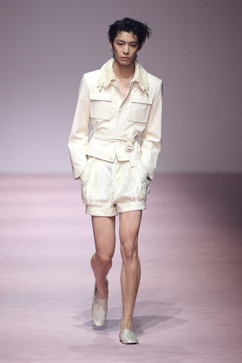 XU ZHI 2026 春夏系列以 Arthur Rimbaud 这位浪漫主义诗人的精神世界为起点,探寻理想主义与颓美的边界,将其漂泊的诗意底色与游历轨迹转化为一场跨越世纪的美学对话。 设计师陈序之从垂坠褶皱、东欧刺绣、吉普赛流苏与巴黎沙龙绸缎中汲取灵感,以解构与拼贴的手法带来纯粹而恒常的设计张力。融合了来自不同时代与地域的多元文化符号、美学印记与图案纹样:细腻的褶皱肌理与波西米亚风格手工艺在面料间轻盈流转;古希腊爱奥尼克柱式的优雅与陶器上的棕榈纹、回纹勾勒出古典之美;William Morris 经典繁复的自然元素则经过提花与立体珠绣的重新演绎,呈现出一场融合古典浪漫与率真叛逆的精神对话。 本季,品牌标志性的编绳流苏与精致刺绣被赋予了新的诠释:水溶蕾丝的轻盈质地与贴布绣、盘带绣的立体层次相得益彰;受新艺术运动启发的蜿蜒流畅、不对称的藤蔓花卉被转化为立体的珠绣细节;William Morris 笔下缠绕的枝蔓、盛开的花簇与鸣叫的鸟儿在典雅的提花中绽放。这些细腻的工艺细节仿佛呼应着兰波笔下对永恒的追寻,以针线描绘诗人漫游时所见的异域风情。绣线游走于面料之间,或如荒野中摇曳的青草,或似远方陌生城市里斑驳的街灯,一针一线都在诉说着对自由与远方的向往。 秀场演绎以一种渐进的叙事展开:从静谧的旷野气息起始,随着造型的推进,廓形与材质逐渐呈现出丰富变化。秀场造型悉心呈现了与英国经典功能性时尚品牌 HUNTER 的特别合作,标志性「Original Wellington Boot」为合作造型注入了随性而实用的探索气息。这些造型仿佛在讲述一个游历于都市与荒野之间的探索者故事,每一个细节都在暗示着不受拘束的旅途精神,巧妙地连接着经典传统与现代、优雅与实用,呼应着「追寻」与「逃离」的永恒主题,展现出兰波式探索远方的不息渴望。 秀场铺就柔和的粉色地毯,仿佛通往远方的诗意旅途。现场音乐由 Tutu Chan 创作,12 弦鲁特琴的开场旋律与层叠的弦乐、海浪声交织,在 E 和声小调与 C 小调间流转。伴随着受兰波启发再创诗句的念白,营造出梦境般的漂泊感,整场如诗人旅途的延伸,于现实与幻象之间,追寻那片「生活在别处」的浪漫。 这场诗意的表达是兰波式漂泊的最佳注脚,这个系列不仅是对浪漫主义精神的致敬,更是对当代人心灵自由的深情呼唤。在快速变迁的时代,XU ZHI 用细腻的工艺与创新的设计理念,为观众开启了一扇通向诗意栖居的大门。对自由与远方的不懈探索,终将指引我们找到那个「别处」的浪漫世界。 |
