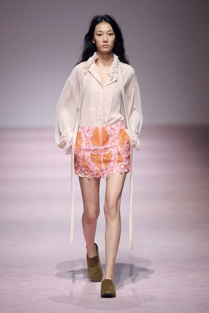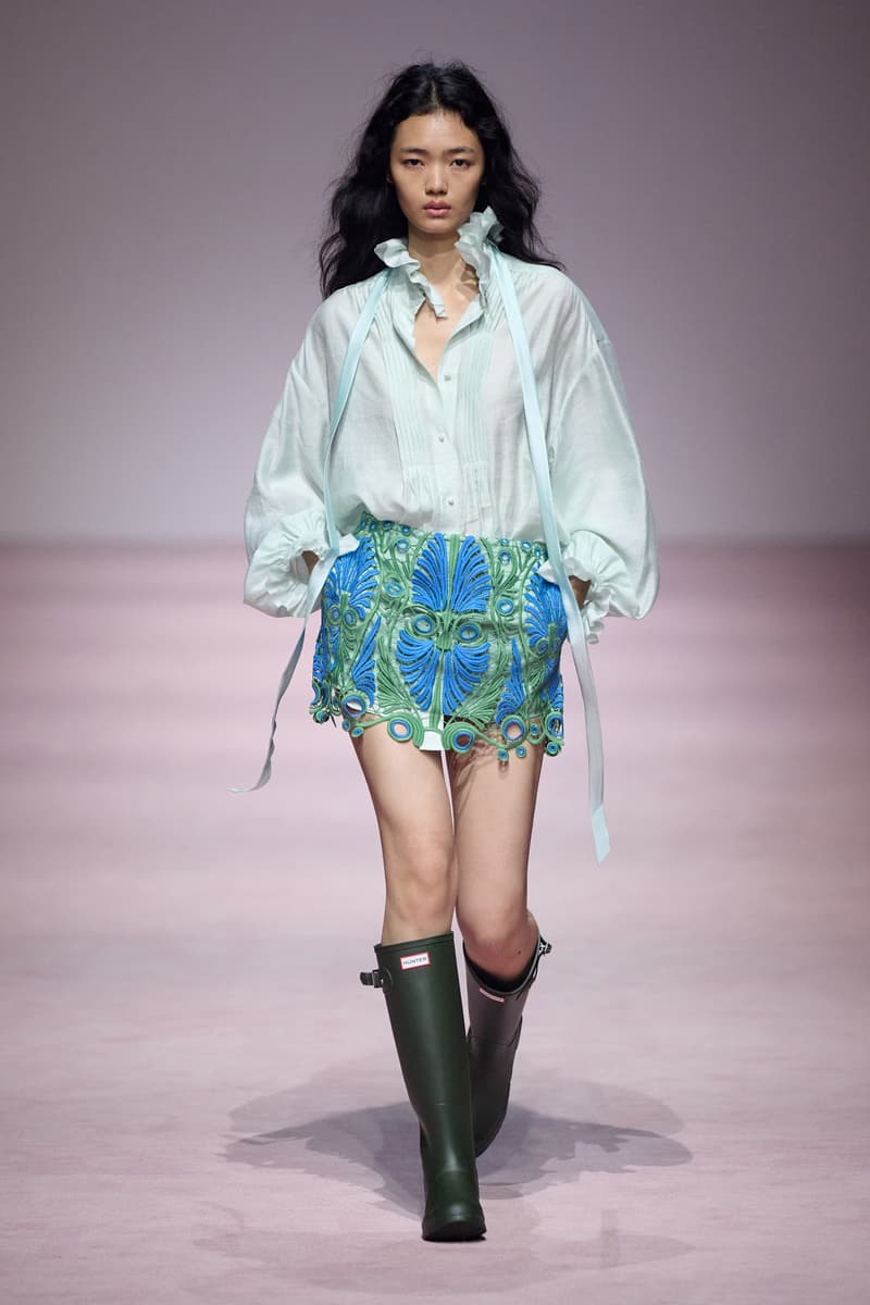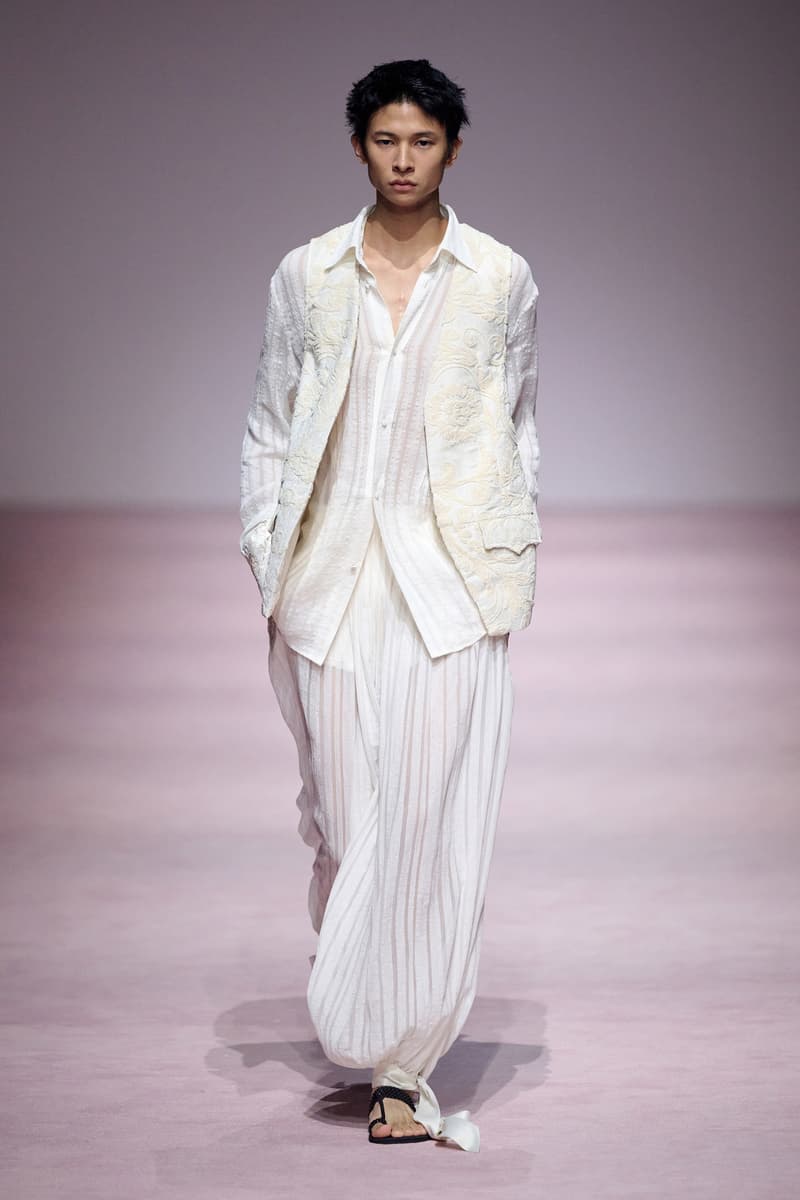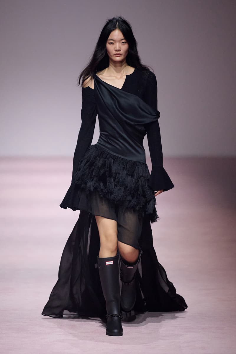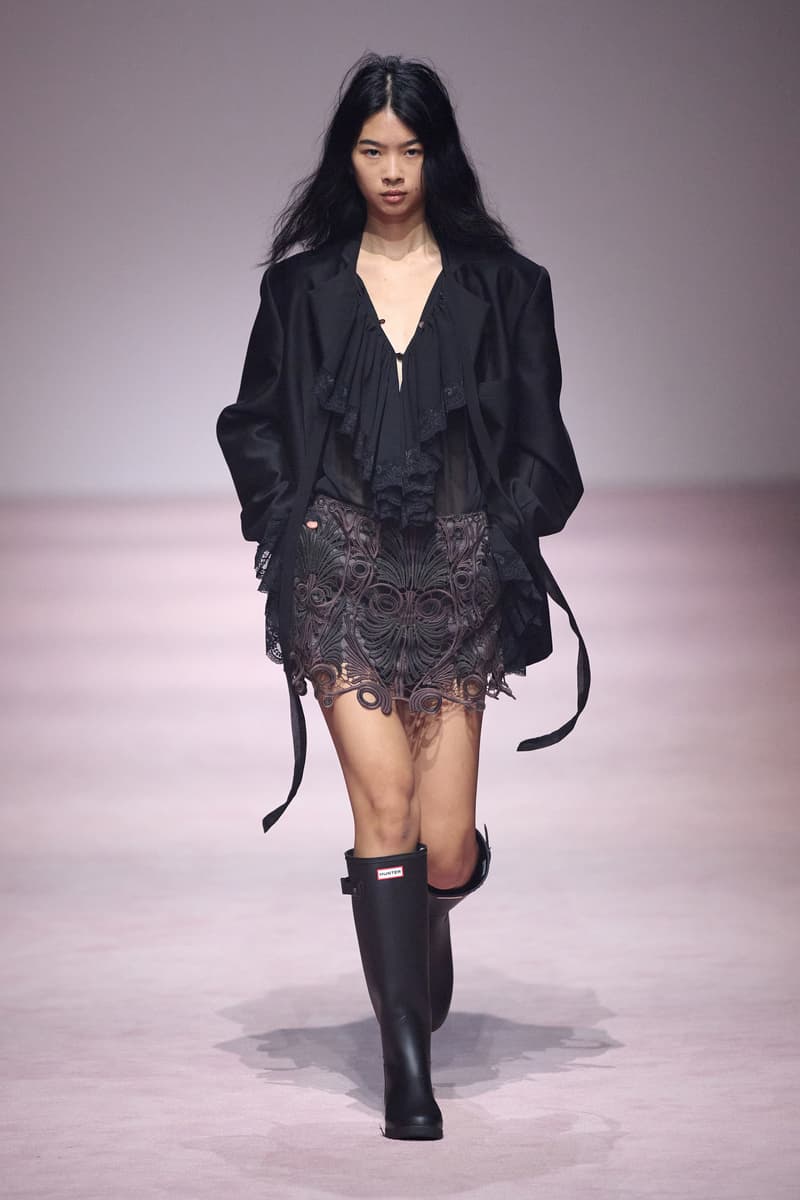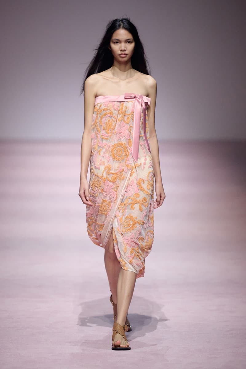 XU ZHI 2026 春夏系列以 Arthur Rimbaud 这位浪漫主义诗人的精神世界为起点,探寻理想主义与颓美的边界,将其漂泊的诗意底色与游历轨迹转化为一场跨越世纪的美学对话。 设计师陈序之从垂坠褶皱、东欧刺绣、吉普赛流苏与巴黎沙龙绸缎中汲取灵感,以解构与拼贴的手法带来纯粹而恒常的设计张力。融合了来自不同时代与地域的多元文化符号、美学印记与图案纹样:细腻的褶皱肌理与波西米亚风格手工艺在面料间轻盈流转;古希腊爱奥尼克柱式的优雅与陶器上的棕榈纹、回纹勾勒出古典之美;William Morris 经典繁复的自然元素则经过提花与立体珠绣的重新演绎,呈现出一场融合古典浪漫与率真叛逆的精神对话。 本季,品牌标志性的编绳流苏与精致刺绣被赋予了新的诠释:水溶蕾丝的轻盈质地与贴布绣、盘带绣的立体层次相得益彰;受新艺术运动启发的蜿蜒流畅、不对称的藤蔓花卉被转化为立体的珠绣细节;William Morris 笔下缠绕的枝蔓、盛开的花簇与鸣叫的鸟儿在典雅的提花中绽放。这些细腻的工艺细节仿佛呼应着兰波笔下对永恒的追寻,以针线描绘诗人漫游时所见的异域风情。绣线游走于面料之间,或如荒野中摇曳的青草,或似远方陌生城市里斑驳的街灯,一针一线都在诉说着对自由与远方的向往。 秀场演绎以一种渐进的叙事展开:从静谧的旷野气息起始,随着造型的推进,廓形与材质逐渐呈现出丰富变化。秀场造型悉心呈现了与英国经典功能性时尚品牌 HUNTER 的特别合作,标志性「Original Wellington Boot」为合作造型注入了随性而实用的探索气息。这些造型仿佛在讲述一个游历于都市与荒野之间的探索者故事,每一个细节都在暗示着不受拘束的旅途精神,巧妙地连接着经典传统与现代、优雅与实用,呼应着「追寻」与「逃离」的永恒主题,展现出兰波式探索远方的不息渴望。 秀场铺就柔和的粉色地毯,仿佛通往远方的诗意旅途。现场音乐由 Tutu Chan 创作,12 弦鲁特琴的开场旋律与层叠的弦乐、海浪声交织,在 E 和声小调与 C 小调间流转。伴随着受兰波启发再创诗句的念白,营造出梦境般的漂泊感,整场如诗人旅途的延伸,于现实与幻象之间,追寻那片「生活在别处」的浪漫。 这场诗意的表达是兰波式漂泊的最佳注脚,这个系列不仅是对浪漫主义精神的致敬,更是对当代人心灵自由的深情呼唤。在快速变迁的时代,XU ZHI 用细腻的工艺与创新的设计理念,为观众开启了一扇通向诗意栖居的大门。对自由与远方的不懈探索,终将指引我们找到那个「别处」的浪漫世界。 |
