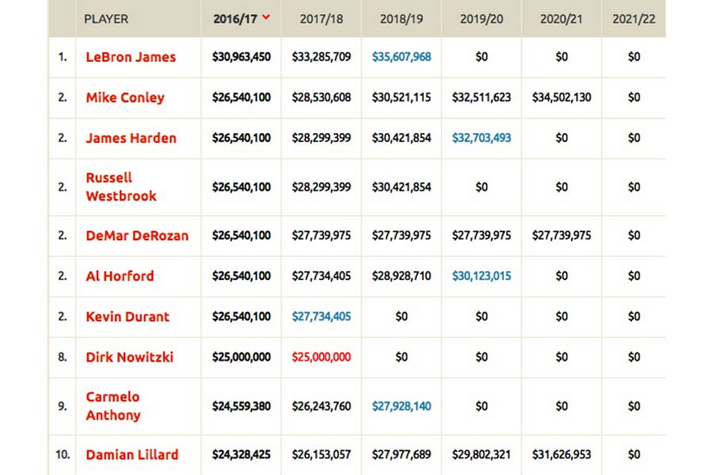 随著 NBA 2016-2017 赛季的临近,最新赛季的球员薪金排行榜也随之出炉。上赛季总决赛 MVP LeBron James 在今年 8 月宣布将留守在 Cleveland Cavaliers 3 年,首年工资就已高达 3.1 千万美元,使其当之无愧成为了最高工资球员。而 Mike Conley 在今夏也与 Memphis Grizzlies 签了大合同,以 2.6 千万美元排在第二位,但遭到不少网友和球迷的吐槽。而上赛季常规赛 MVP Stephen Curry 因在 2012 年与 Golden State 签署了一份 4 年 4.4 千万美元的合同,所以在新赛季的工资排名仅在第 82 位。感兴趣的朋友可前往 ESPN 查看完整排名。 |