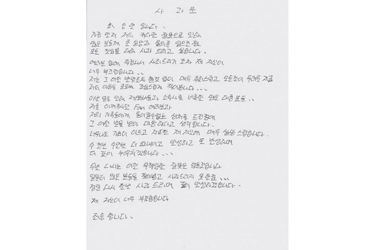 BIGBANG 的成员 T.O.P 因吸食大麻事件牵连甚广,继 BIGBANG 队长 G-Dragon 日本大阪所举行的《BIGBANG SPECIAL EVENT》歌迷见面会上为 T.O.P 致歉后,今日 T.O.P 亦终于透过其所属的 YG 事务所 Twitter 上载了一封手写信为事件道歉,内容大致有关 T.O.P 承认这是一次巨大的错误,没有面目站到大家面前,并对身边,包括 BIG BANG 成员、事务所及大众造成的伤害感到非常的后悔及恐慌,他愿意接受任何责罚。 |