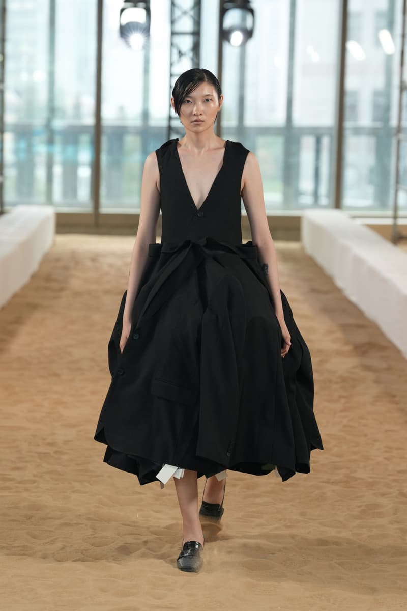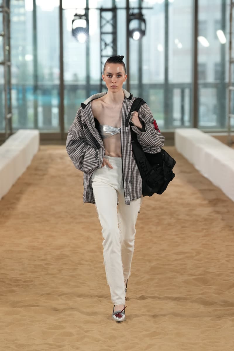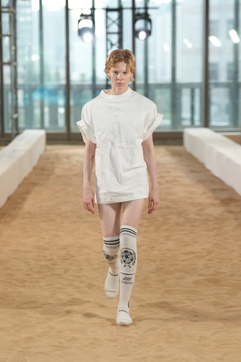 十月,上海的秋意里仍浮动着夏日未尽的躁动。人群、街道、高楼间的喘息,都在周末来临前酝酿着一场出逃。在消费如潮的当下,「精致穷」已成为一种不言自明的常态,在这场被精心编排的「自我定义」游戏中,人们在看得见的地方极致投入,却在看不见的地方极致压缩。当一只包袋价值普通人数月的薪水时,我们忍不住探讨,我们所追求的「精致」,究竟是别人定义好的模板,还是真正源于内心、敢于打破规则的、自由的自我表达? MASONPRINCE 2026 年度时装发布会以「玩乐时间」为灵感,于现实与幻想的裂隙之间,构筑一个超越线性时间的异质时空,将未完成的空间叙事转化为时空扭曲的超现实主义影像:引力在毛坯中庭蜿蜒曲折,时空随着钟表的融化变形,感知游移于真实与虚幻的边界。在这里,逻辑失去坐标,直觉成为导航,错乱成为新的秩序。当一切规则失去效力,时装是否仍需承担「扮演」的使命? 答案,早已藏在每一个颠覆的造型中。超长球袜改造而成的鞋子、满印夏日元素的蕾丝长裙、被大幅度收窄的裤脚、刻意露出的后领标、由衬衫堆叠而成的礼裙…品牌一贯强调矛盾与冲突感,以「不合理」的姿态挑战时尚教条。造型的性别颠倒、材质的不合理性、极度反差的风格混搭、将日常物件“时尚化”…这举重若轻的“反时尚”游戏,恰是对消费主义最犀利的调侃。 此刻,规训已被狂欢取代。在这处注定成为消费载体的场景内,MASONPRINCE 借扭曲剪裁、解构重组与立体拼接等手法,打破规训化审美,将时空错乱的感知具象化,探索符号化消费与自我定义潜在的矛盾与共生关系,精准解构消费主义。 而这场发布会,更像是一场解放于符号化消费的狂欢。我们拆解所有身份标签,让衣橱成为不设界限的游乐场。秀场将沙滩搬进粗旷的水泥空间,以高级拉绒地毯创造出一片「海洋」,用最经典的配色元素营造轻快的假日氛围。而秀道两侧的钢筋和脚手架却「不合时宜」地出现在这度假海滩,将观众瞬间拉回熟悉的城市景观。这样看似反逻辑的组合所带来的矛盾感,从更宏大的场景表达本次秀场的核心主题。 当音乐渐退,人群散去,MASONPRINCE 2026 年度时装发布会也顺利闭幕。而品牌面对时尚与消费主义的“玩乐”态度越发鲜明,不设限的自由表达亦越发确立。  |