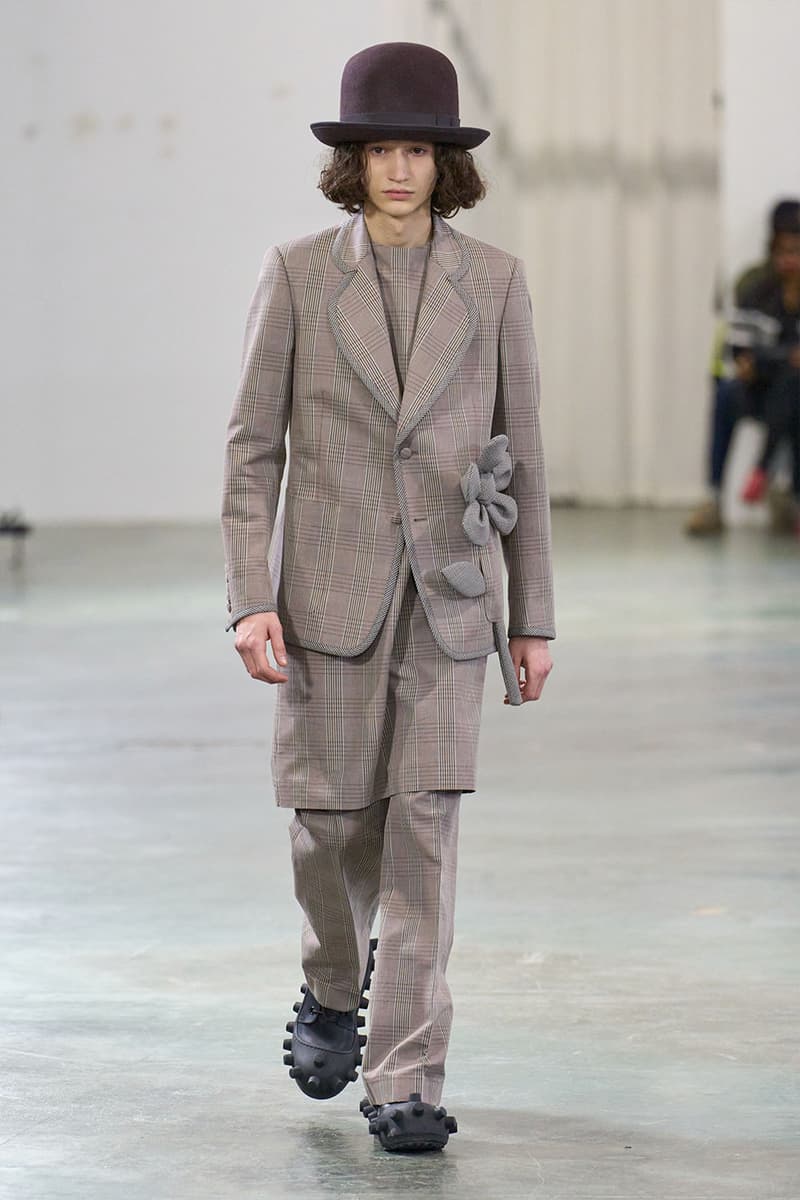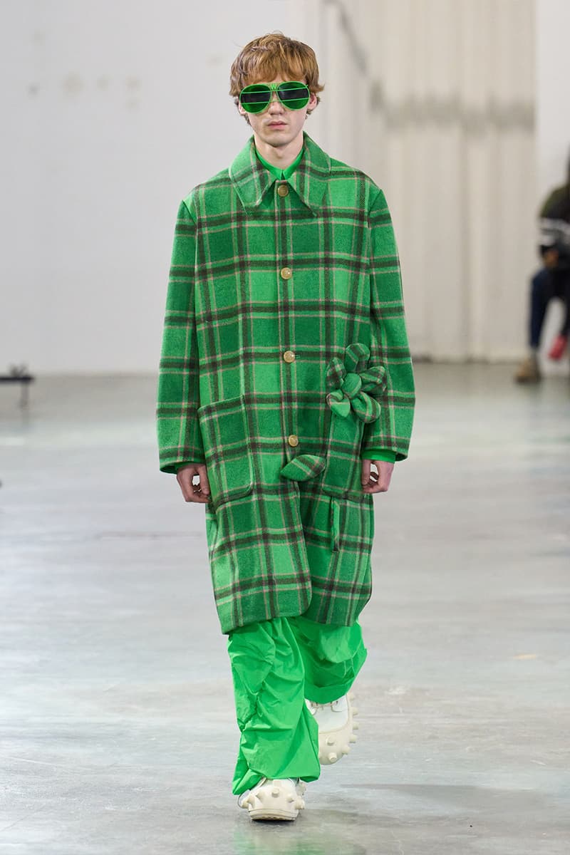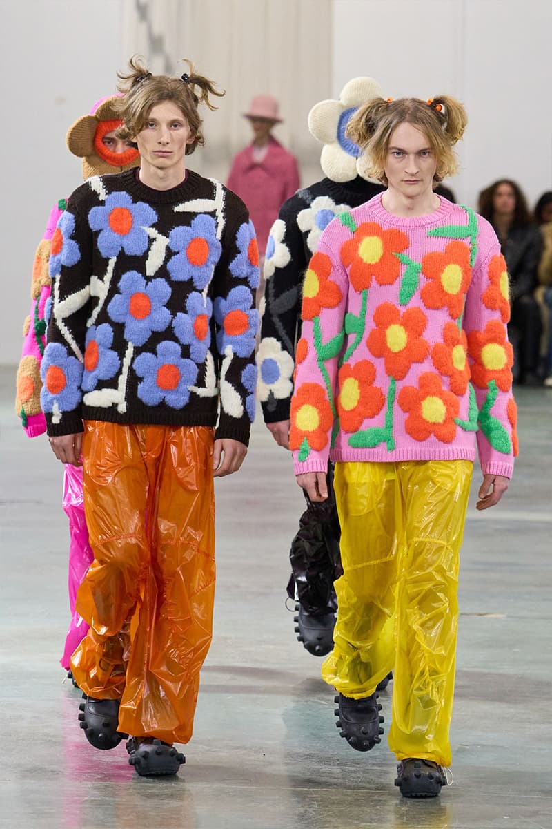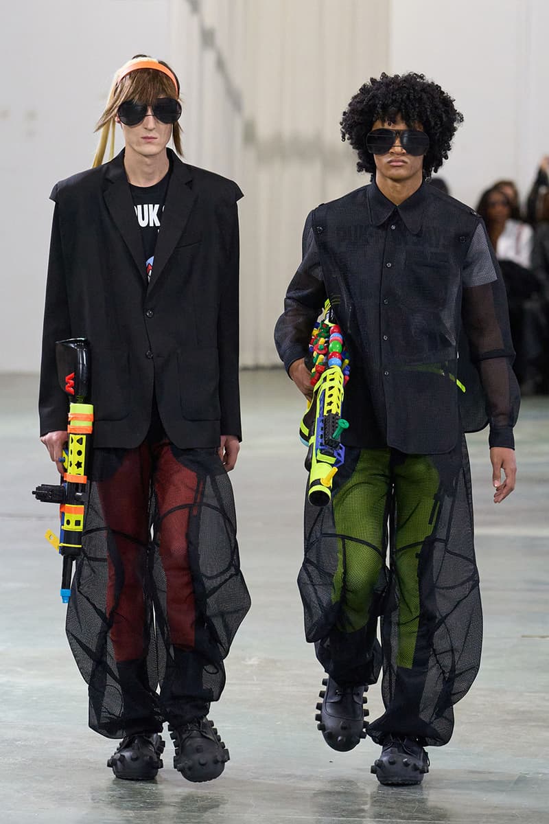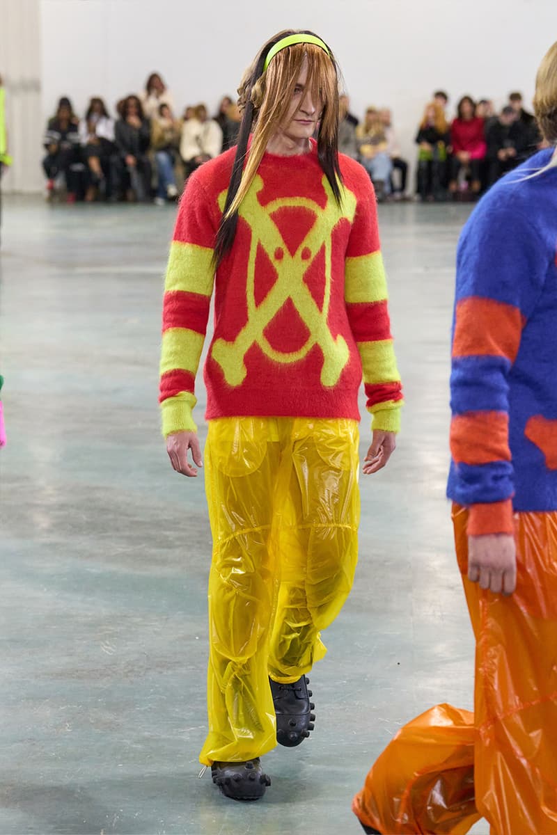在传统亚文化早已消散于数字虚空的当下,Walter Van Beirendonck 为 2026 秋冬再度回到边缘地带。本季以「SCARE the CROW / SCARECROW」为题,是一场关于 Art Brut——这类局外者的「原生艺术」的深度凝思。直取 André Robillard 临时拼组的废金属武器为灵感源,Van Beirendonck 在服装语境中推演出「攻击」与「温柔」之间的张力。这是以衣装为名的生存工具箱,由孩童式未经修饰的迫切冲动,与流亡者般的防御本能,一点一滴拼装而成。 系列忠于 Van Beirendonck 一贯张扬怪诞的视觉 DNA,以铺天盖地、极致耀眼的色彩炸裂全场,与他口中所谓的「克制」背道而驰。模特们带着一整套「矛盾语汇」缓步出场,手中握着玩具水枪与毛绒「武器」,隐喻攻击性与童年柔软之间那道若即若离的拉扯。服装的模块化结构在配饰中得到呼应:模特背负 Eastpak 双肩包与化身神秘怪兽轮廓的手袋,让实用物件与幻想生物的界限变得暧昧朦胧。 从覆盖雕塑的防尘罩汲取灵感,衣物像一层层披覆在身体上的「灵魂罩衣」,轻柔却具防护意味。技术层面上,3D 打印花朵与塑料「武器」与 Eastpak 一体式罩衫精妙组合;英国羊毛与工业胶带、尼龙相互碰撞,为 2026 年的年轻人锻造出一副都市战甲。伴随 Puk Puk 的回归,Van Beirendonck 向新世代发出一记挑衅式讯号:Scarecrows 已经现身,他们色彩斑斓,而且真实存在。 |